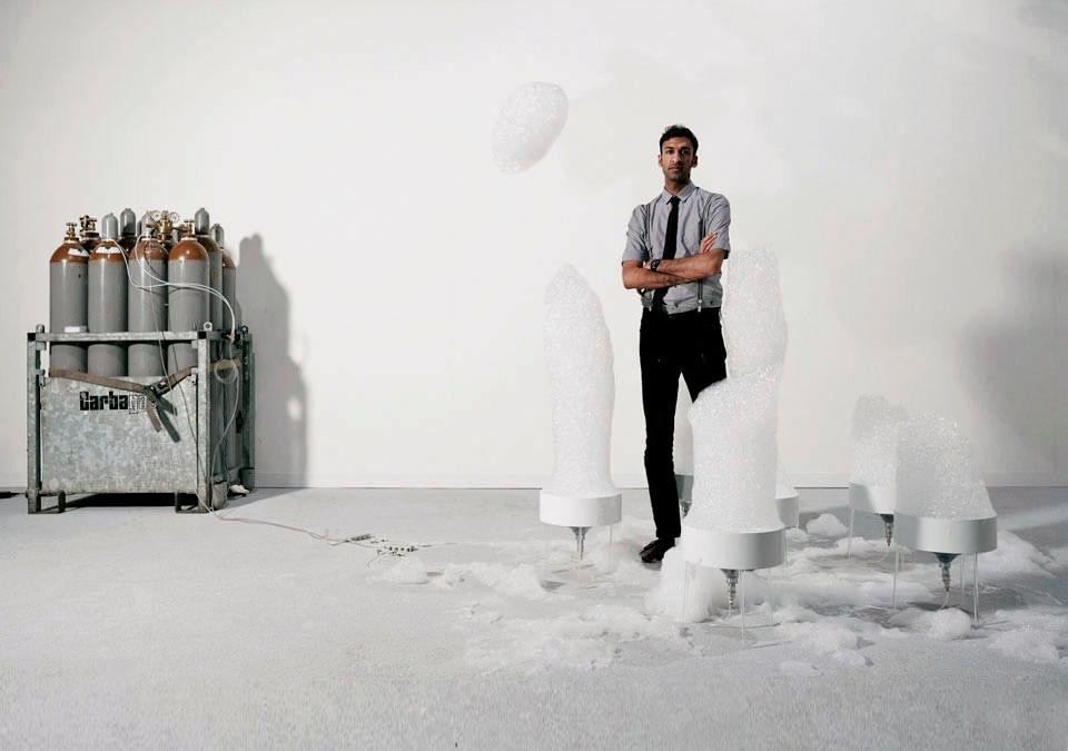 Asif Khan, a young English architect, honored by MoMA and profiled in the New York Times as one of five designers to watch this year, presents "Cloud," a machine that creates airborne volumes of soap bubbles. The foam inside rises slowly upward, deforming like a cloud to be caught in fish net stretched across the ceiling, from which a light rain begins to fall after a few hours.