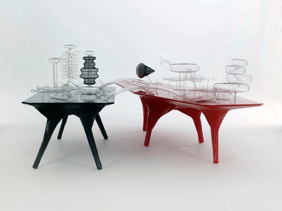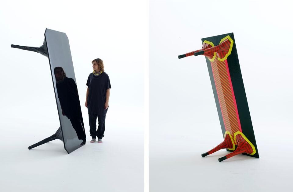 El Ultimo Grito's tables are created to work on multiple axes. The Hanging Table is a monolithic form vertically, re-assembled horizontally it returns to conventional form. The table structures use cardboard as the base construction material to form non-geometric, organic-like furniture and are heavily coated (as if dipped) in fibreglass. Their resin finish creates an immediate contradiction between the throw away, biodegradable cardboard interiors, and their durable high-finish outer shell. These works instill the presence of both sculpture and functionality, and are set in motion with a variety of corporeal attitudes and tactile responses. They are made to be responded to, both physically and psychologically, posing questions about our social experience to objects.