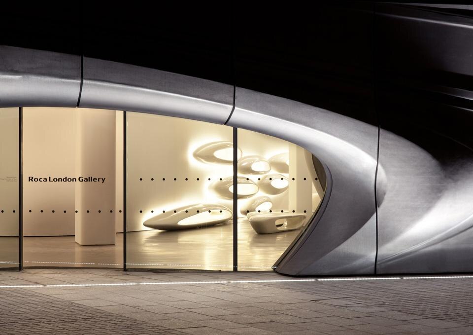 Roca's commitment to design and innovation is clearly visible in the exterior of the building with its distinctive and unique façade which gives the Roca London Gallery its identity. Three almost organic portals which appear to have been shaped by water erosion open up this space to the city.
