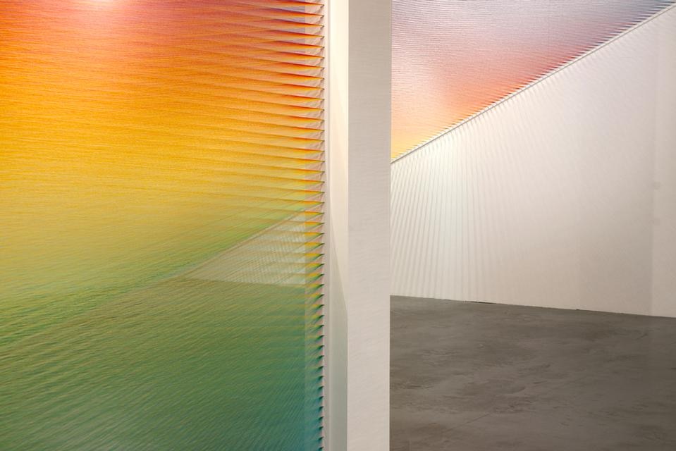 Materialising the Structure of Light centres around a new commission from the artist's awe-inspiring Plexus series. Having just wrapped Plexus No. 9 at PEEL Gallery in Houston, Dawe creates his most ambitious effort yet with Plexus No. 10. Developing out of the artist's practice of embroidering on clothing, and inspired by the traditional richly hued embroidery of his native Mexico, the Plexus installations use colour to dazzling effect. Utilising rainbow hued Gütterman thread to produce a disorientating effect reminiscent of Op Art, the installation will transform the entire Main Gallery. Giant veils of shimmering colour and line, stretching from floor to ceiling, will create an immersive environment which visitors will be invited to walk through, experience, and contemplate.