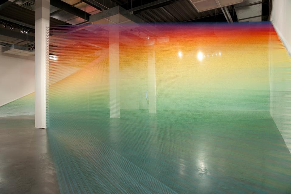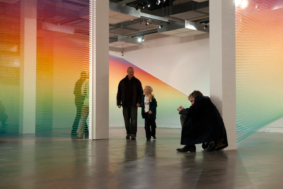 Giant veils of shimmering colour and line, stretching from floor to ceiling, create an immersive environment which visitors walk through, experience, and contemplate.