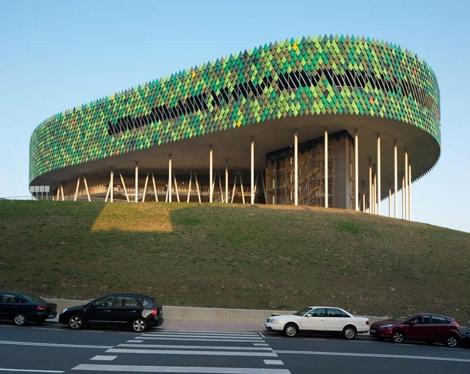 Natural metaphors were touchstones of design: the Bilbao Arena was designed like a tree, whose pillars brace the elements of the structure's metal façade of painted steel sheets in various colors, construct an air-permeable surface that hides all the machinery for climate control. The sports center was designed more like a rock, with precast, textured concrete panels colored like the gray limestone of the surrounding area. A hollow in the "rock" opens up the three areas of the sports center—access to parking, gym and swimming pool—to communicate with each other visually, in cascading stages. And the arboreal mass of the Bilbao Arena, covered in green panels, juts out over the rock.