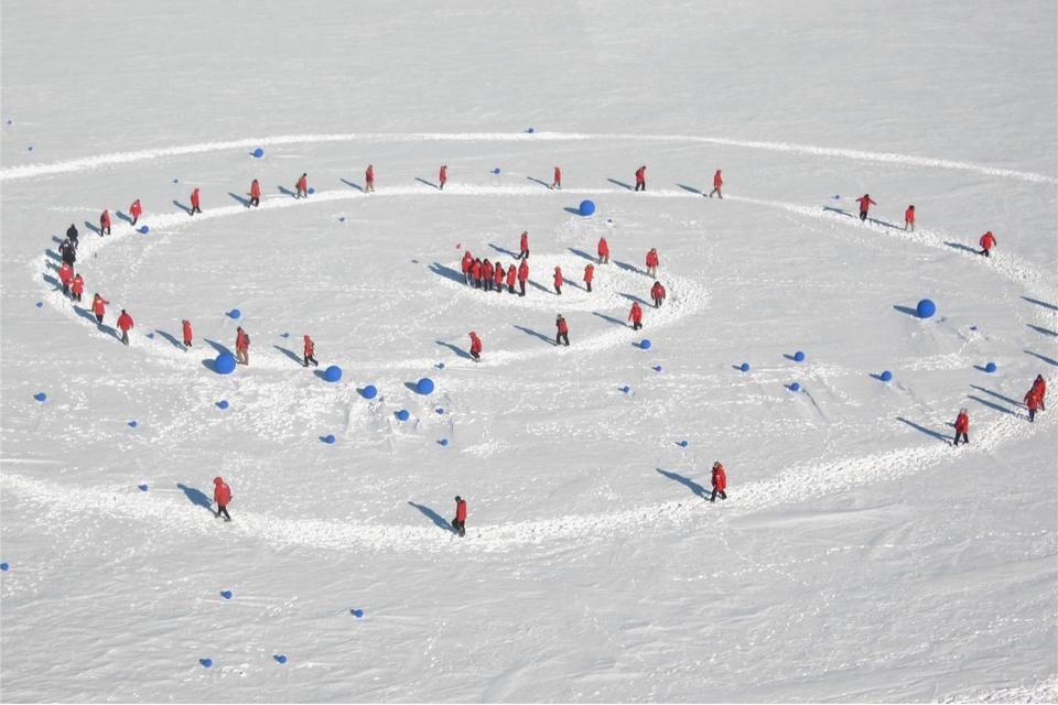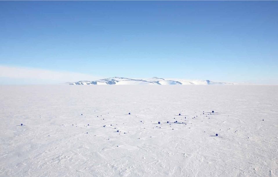 The installation consisted of 99 blue spherical structures arranged on the polar ice in exact, calculated alignment with 99 stars. Each sphere's diameter correlated to the relative brightness of its unique, corresponding star. The resulting work created a large-scale stellar map on the Antarctic ice. As the planet rotated on its axis and continued to orbit around the sun, the relationship between the spheres and stars began to shift out of alignment, creating an imperceptible spiral of motion at the South Pole. To complete the Antacrtic leg of the Stellar Axis work, a group of 51 scientists and technicians from nearby research facility McMurdo Station aided a performance that traced a spiral path among the spheres. The line drawn by human feet visualized the invisible movement created by the earth's rotation and position of the stars as an ephemeral, human gesture symbolizing the often unseen relationship to our planet, the universe, and ourselves.