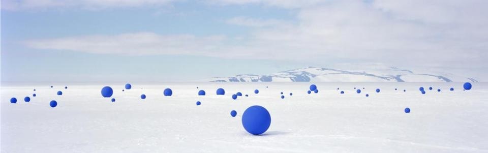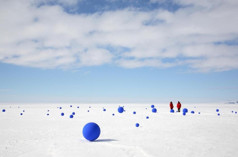 The installation consisted of 99 blue spherical structures arranged on the polar ice in exact, calculated alignment with 99 stars.