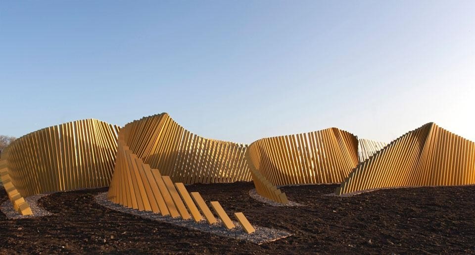 A series of anodised aluminium staves are set in the ground in long arrays which give the impression of giant forms in the landscape. The arrays are arranged in layers so that the shape of the piece transforms as people pass by. Fabricated in gold anodised aluminium, Blaze is designed to catch the light in unusual ways creating a bright sculptural form along the often dreary dual carriageway landscape.
