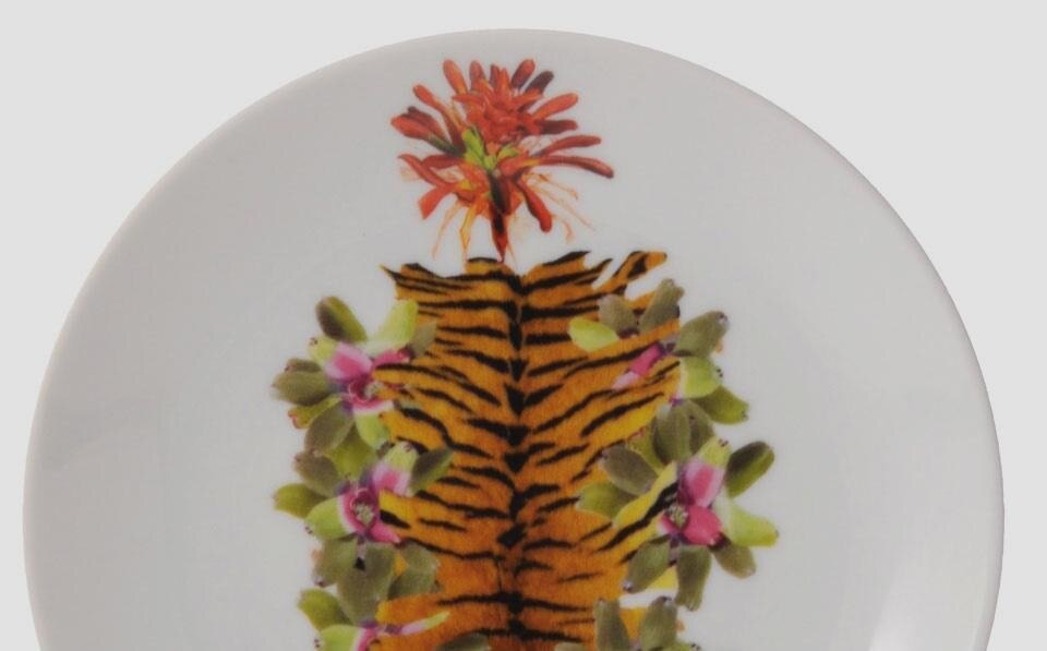 "Upon visiting the Bernardaud workshops in Limoges we quickly became fascinated by the range of technical expertise we discovered there. In the mould casting workshop that we were inspired to do the Nazareth coupe and we tried to push the limits of their capabilities," say the Campanas. "In the decorative workshop, it was the decalque technique that made us want to create Euro Tropiques. In general we work with volume, but here we had to place motifs with the use of collages, cutting and assemblage on flat surfaces."