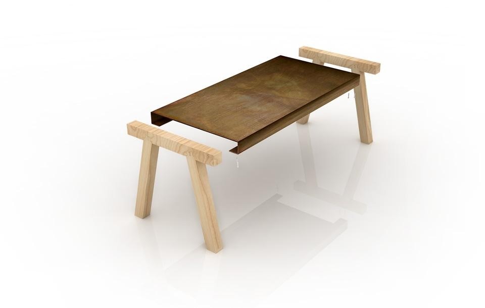 The table is designed for use in the home and office, but is inspired by the workshop.