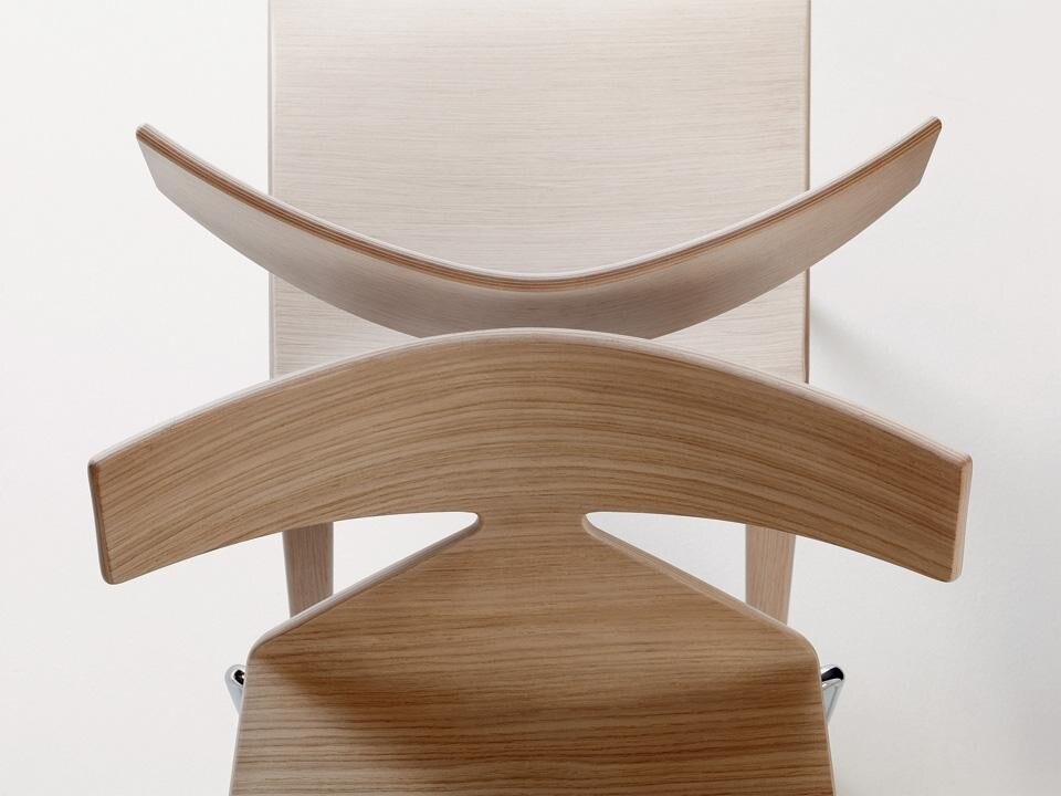 Ergonomics are crucial in a chair and resolved here with a low back that stops just beneath the shoulders to allow freedom of movement. The back is also a distinctive formal and graphic feature of the chair.