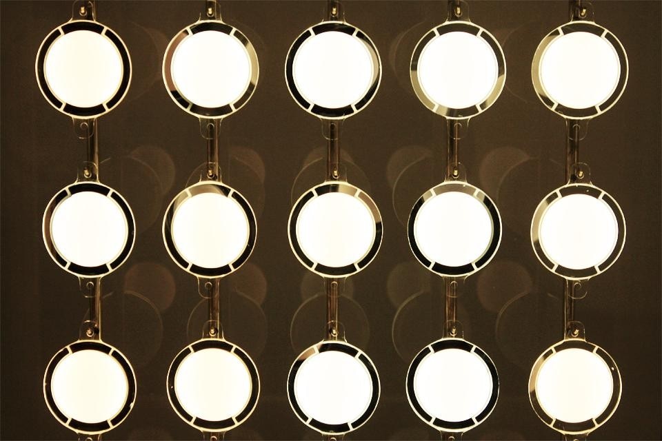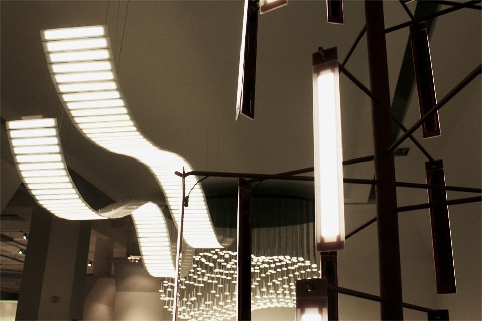 Four lamps by CibicWorkshop are on show: Flying Ribbon, two luminous strips with zero thickness hanging from the ceiling; Blossoms, a floor lamp in the form of a small fruit tree; and Teka, an object seemingly from another time containing 15 circular OLEDs in a wooden case with brass inserts and The Wishing Tree, a design recently set up in the Teatro Ristori in Verona in which luminous rectangular sheets of glass hang from a central metal structure.