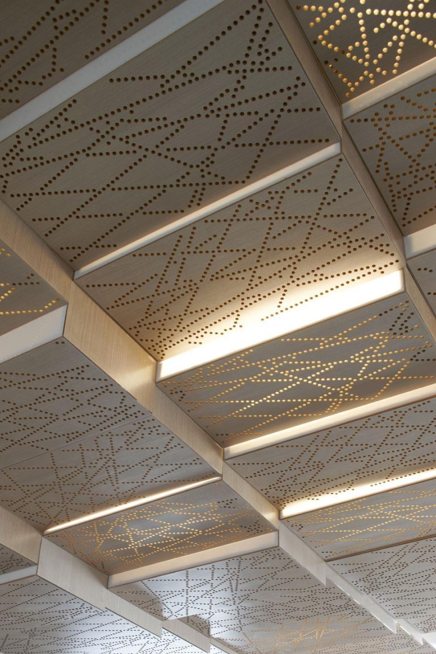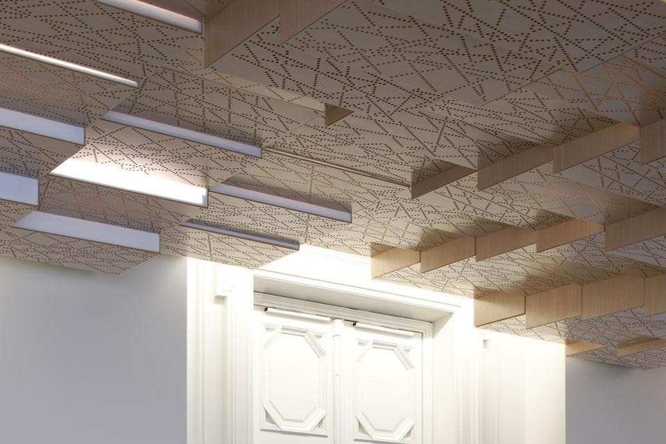 The intervention is especially striking in the treatment of the ceiling, where a high number of technical equipments and utilities needed to be integrated. The suspended ceiling now comprehends a series of boxes with variable altimetry. The slits between the boxes allow for a soft light to diffuse into the space. The depth of the ceiling and the technicality of the wooden boxes allow to conceal and insert all technical constraints and equipment (structural beams holding the four upper floors, ventilation, lighting and public address system, acoustic treatment). Random perforation of the ceiling panels allows for better acoustics and creates a diffusing light in the entire room. The Koto wood used in the ceiling panels echoes the colours and tones as well as the patterns to be found in the flooring, tying the volume together.