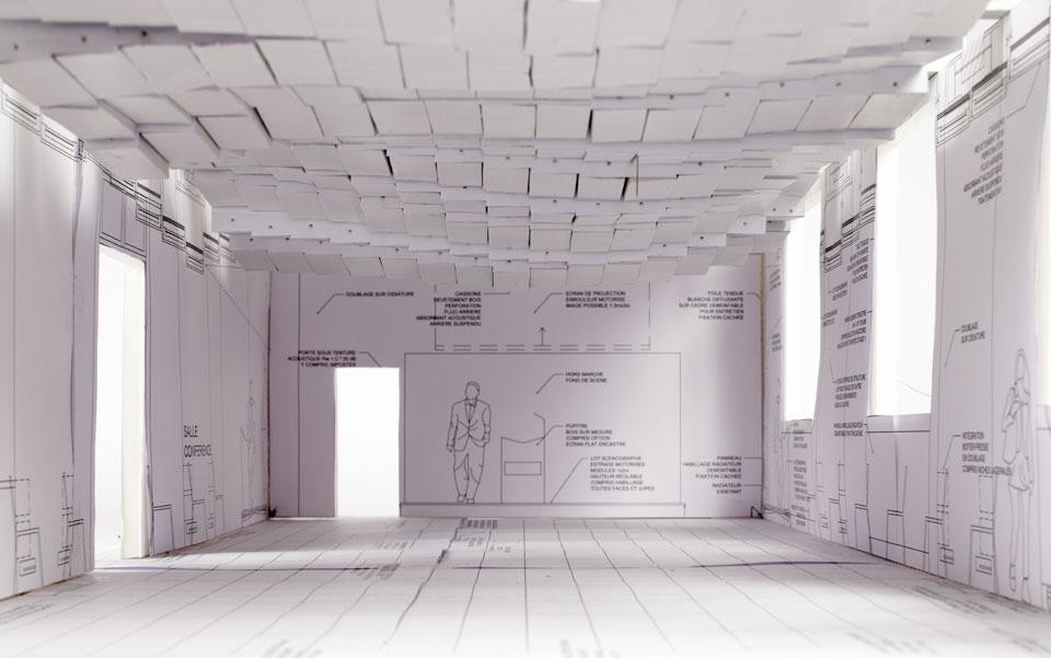A grid acts as a matrix to organize the different elements from the floor to the ceiling. Simultaneously, a generous undulation expands on the floating ceiling, covering the entire room.