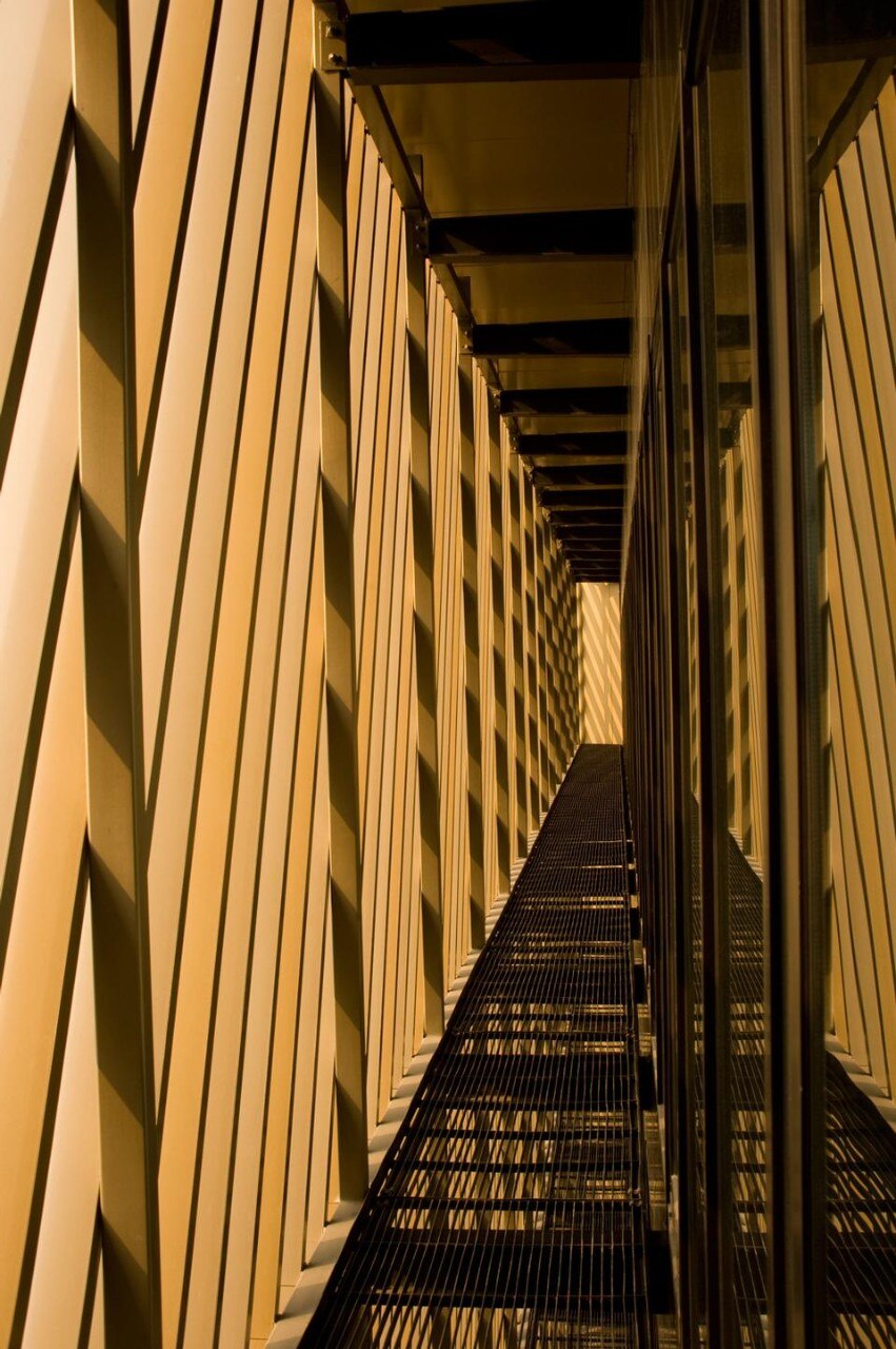 Light also animates the sunshades, which take on different hues depending on the time of day: gray ash, pinkish beige or warm gold. Once again, form takes cues from orientation. The silkscreen prints come alive as they play on dust particles, water and air.