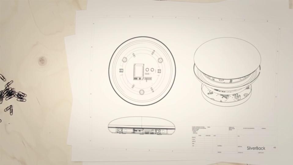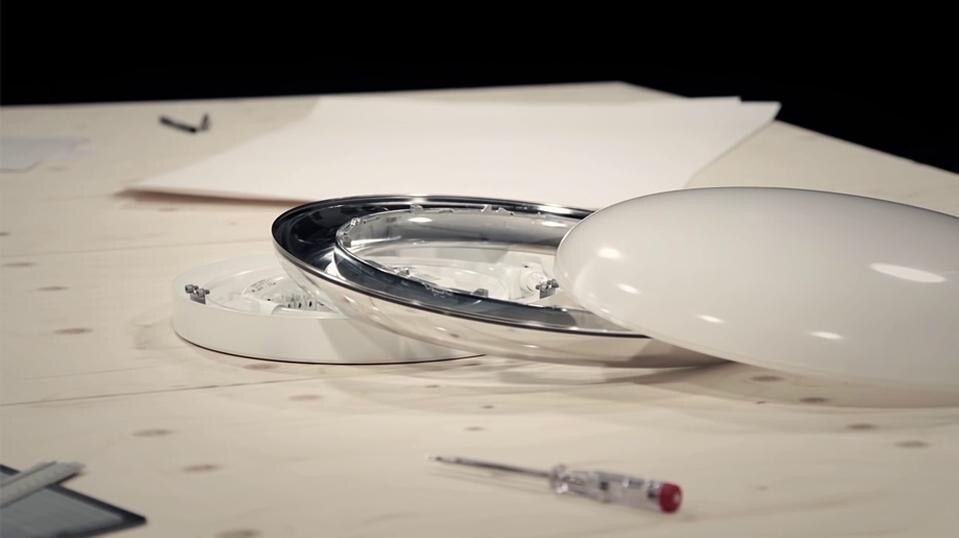Silverback features a soft, waterdrop-like shape. The lamp combines a metallic back with an opal white diffuser: the metallic back mirrors the ceiling or wall the fixture is mounted on, providing a permanent visual detail, whether the lamp is on or off. The mirroring effect gives a unique morphed experience regardless of the background surface, structure, color or material thus allowing for potential unlimited applicability. Silverback was launched in both fluorescent and LED versions.