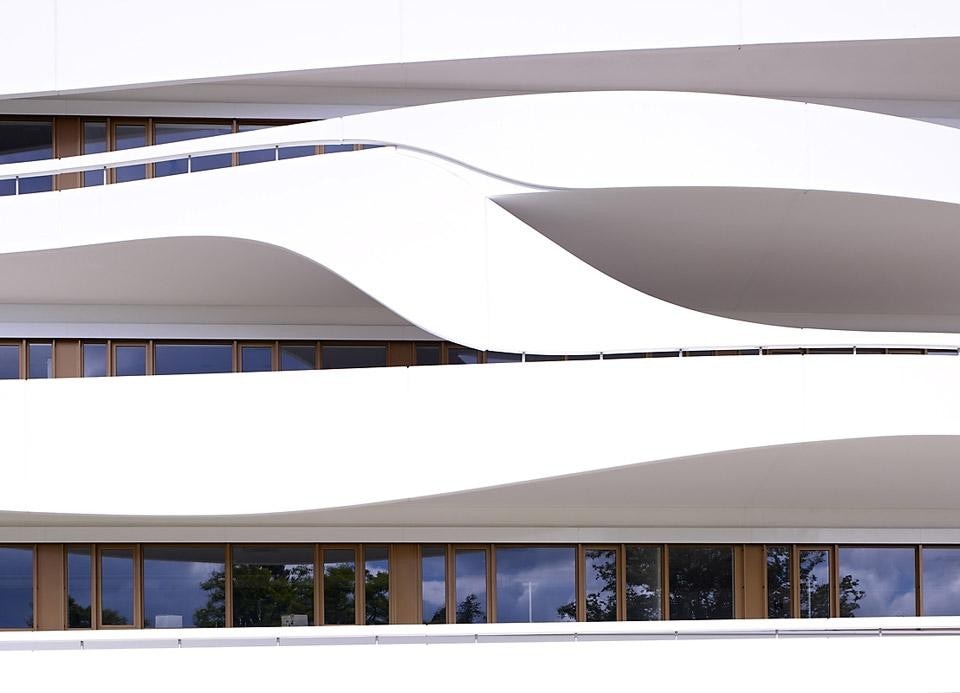 The new Kaffee Partner corporate headquarters represents a contemporary working environment for the approximately 300 employees of the medium-sized company. Curved ribbons on the façade, made of 150 individually fabricated white concrete elements, merge the three buildings of the headquarters into a harmonious ensemble. Their fluid outlines are visually dynamic and conceal the orthogonal grid of the concrete skeleton construction. Other than the façade design for the entire ensemble and the architecture of the administration and customer service wing, 3deluxe also planned parts of the interior finish. The executive suite in the penthouse and the semi-public forum could be equipped with custom-made furniture and high-end fittings that continue the architectural language.