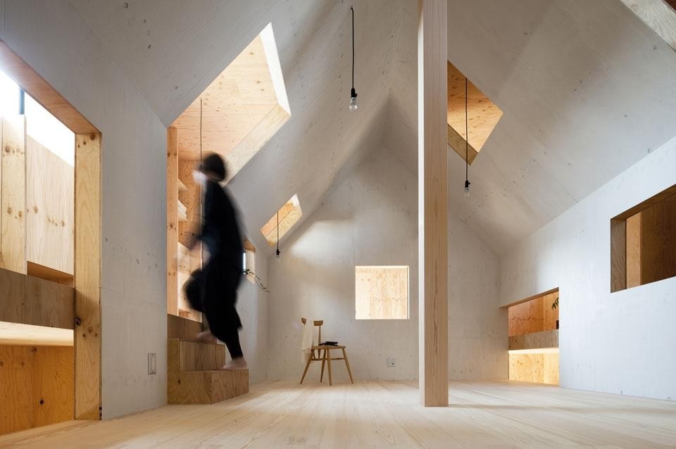 The house begins with a simple rectangular space clad in wooden panels. The kitchen, washroom, desk and storage shelving line this area, creating a room that also functions as a passage. Parallel to this passage is the "free space", topped with a gable roof, with sunlight and the wind coming into the space from an aperture. In the night time, one can see moonlight and hear the singing of insects.