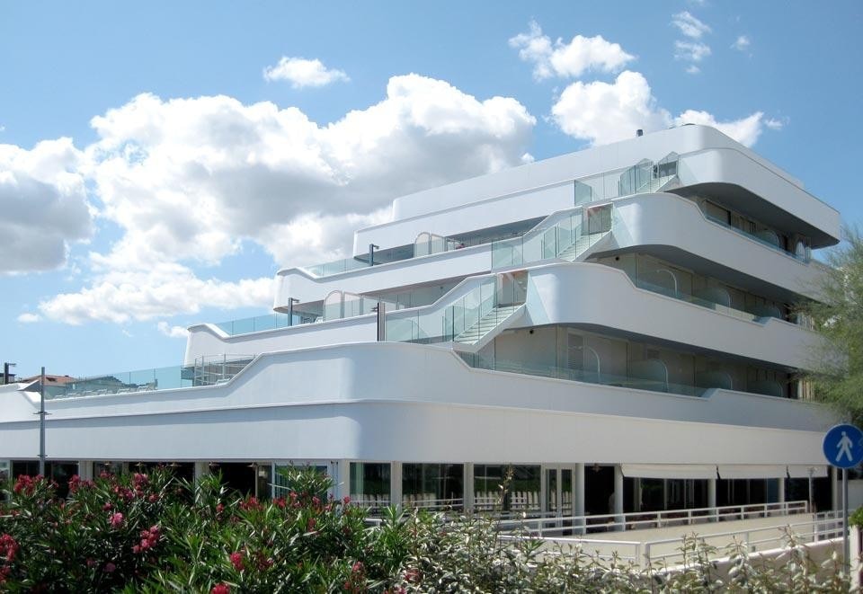 Inspired by the vessels designed and built in Riccione, the new hotel seeks to create connections with the naval architecture of the region. The renovation project of the hotel — which was originally built in the 1960s — was aesthetic and functional, modernizing the services of the historic building.