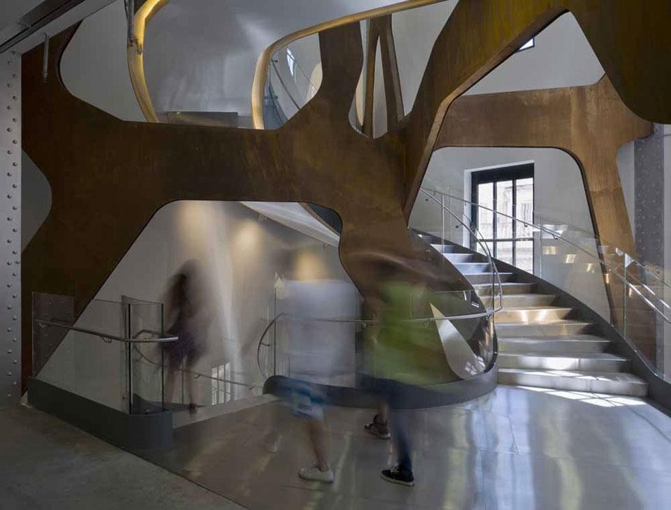 The four-storey building occupies the historic Telefónica Building at the top of Madrid's most central street, the Gran Via. The difficult relationships between the reclaimed spaces of the old building has generated the central focus of the project: a prominent, cohesive circulation path that connects all galleries and cultural spaces on the upper floors to one another and to the street.