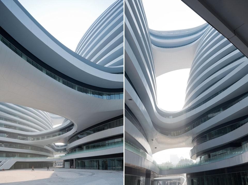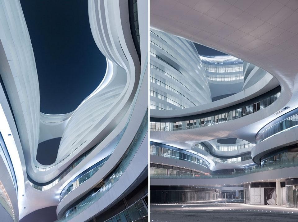 The lower three levels of the building house public facilities for retail and entertainment. The levels immediately above provide work spaces for clusters of innovative businesses, while the top of the building houses bars, restaurants and cafés, while simultaneously offering views along one of the city's avenues. "These different functions are interconnected through intimate interiors that are always linked with the city, helping to establish Galaxy SOHO as a major urban landmark for Beijing," state the architects.