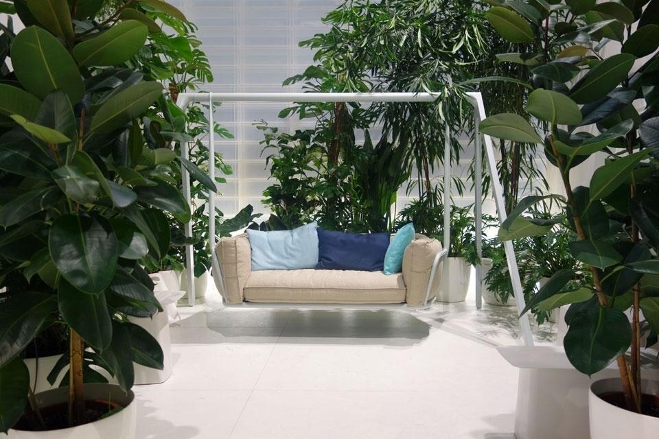 Despite the fact that a rocking sofa is usually associated with leisurely activity — such as a rocking chair on the front porch, or a swing set at the childrens' playground — the German furniture manufacturer has introduced this quiet moment of relaxation into the busy office environment.