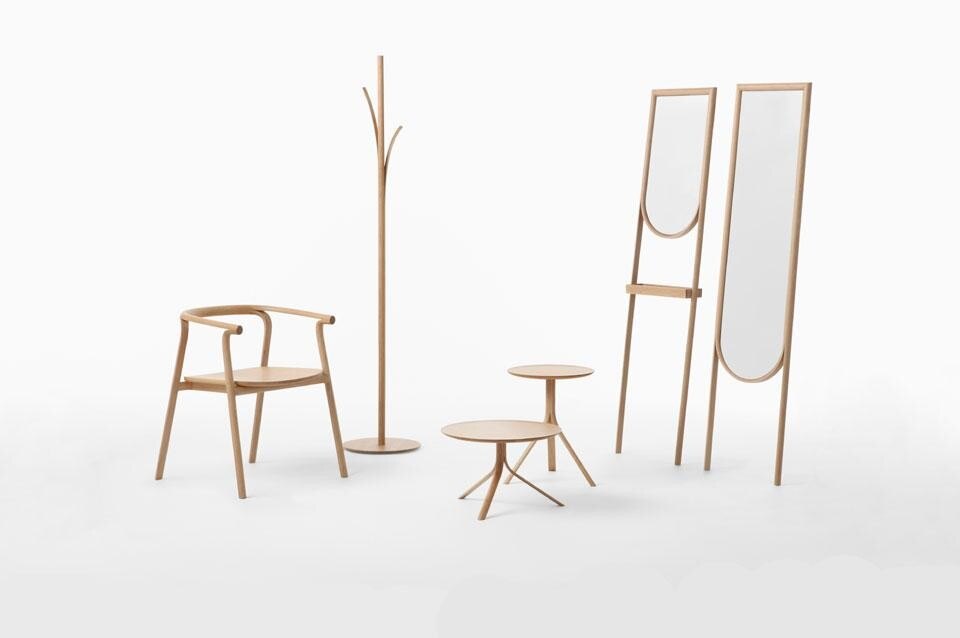 "We splintered each piece of wood as though peeling it away," states the studio, describing the poetic concept behind the design of the collection. "Chairs' backrests divide to become armrests and legs, and the top of the coat stand peels away to provide coat hooks. The side table's stand splinter to turn into three legs."
