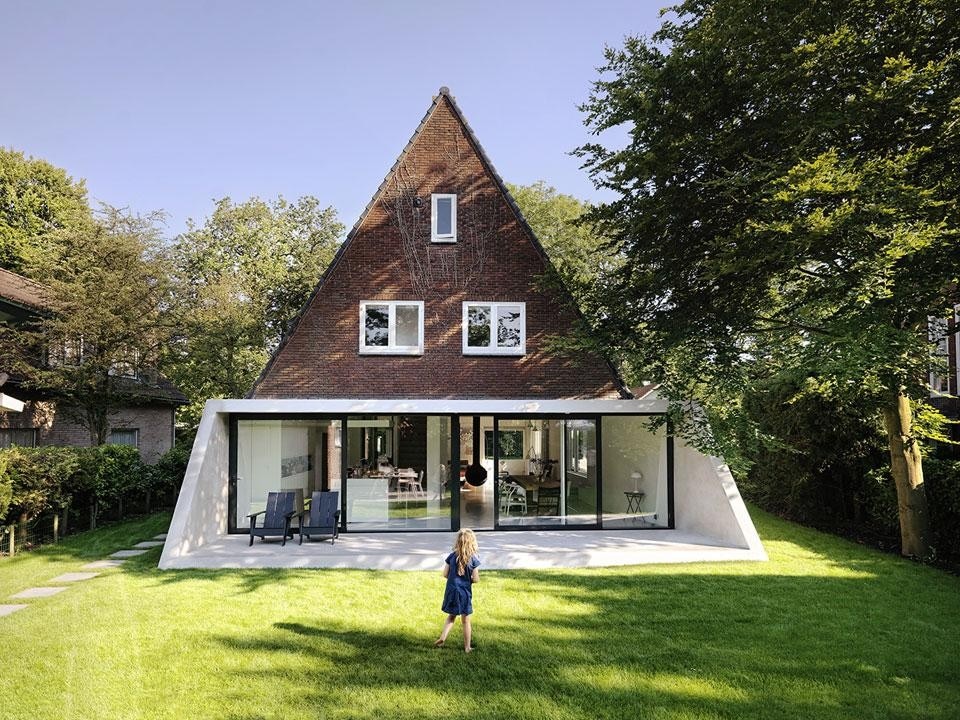The SH House was originally built in 1932, with typical brick walls topped with a gable roof and overhanging eaves. BaksvanWengerden's intervention sought to build upon these vernacular architecture traits, incorporating an additional volume into the previously existing house by continuing the slope of the pitched roof.