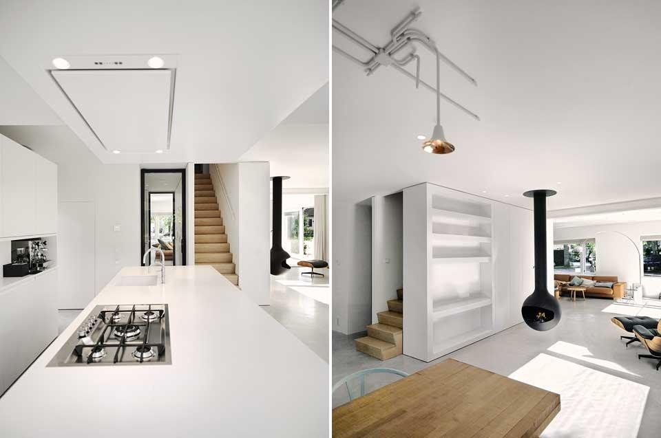 Simultaneously, the open space directs views towards the garden, which is framed by angled white walls. Organising the flow between the diverse spaces, straight run stairway connects the ground floor to the attic on the second floor.