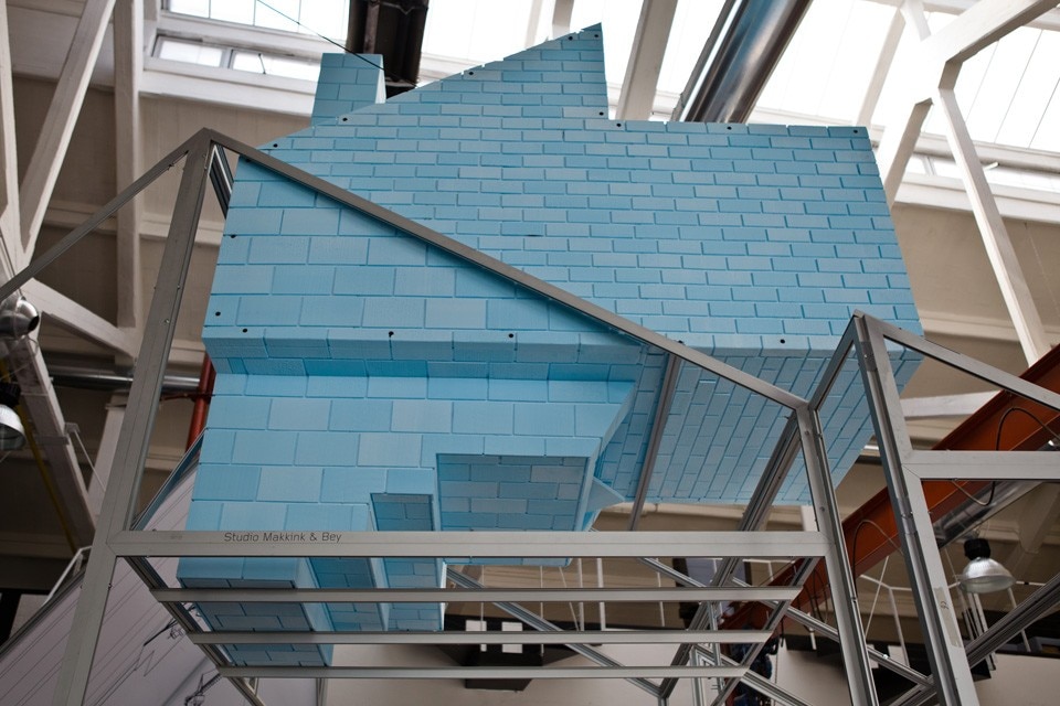 Studio Makkink & Bey has designed a movable work unit: Work At Home can be appended to the rooftop of a house and removed when it is no longer wanted. The prototype is a blue foam structure that doubles as a desk with a shelf and a small heater and chimney. While it can be delivered at your doorstep, construction and installing shouldn't be any harder than installing a simple closet.