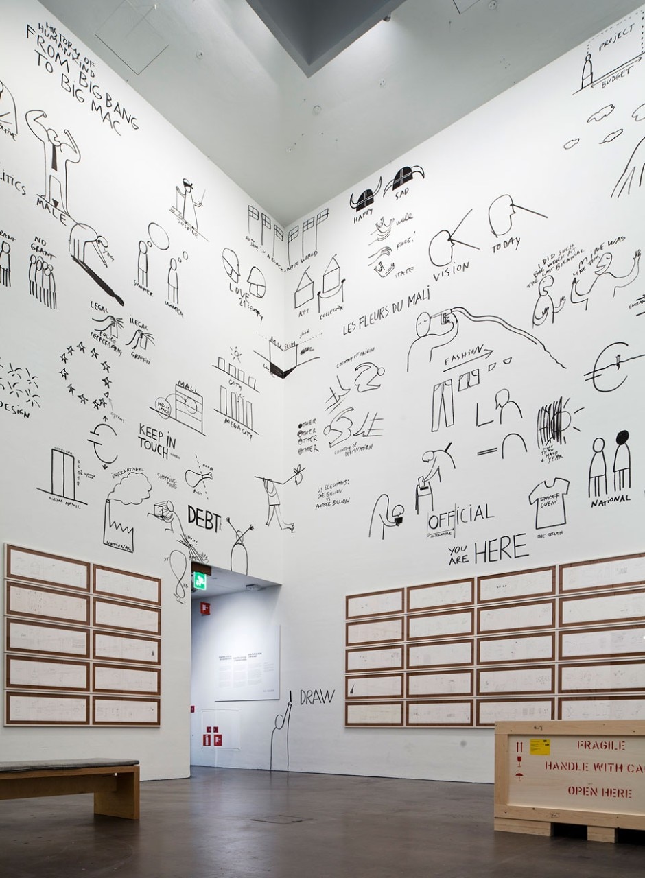 Over the years, Perjovschi has built up a veritable archive of motifs that he recycles from one exhibition to the next. Among them he inserts pictures that comment on topical events and the venue in question. Consisting of over 300 framed drawings, Repertoire – A Five Year Plan (2006–2010) is now on exhibit for the first time. It is a document of Perjovschi’s earlier installations. He sent five drawings from each of his exhibitions to Van Abbemuseum in the Netherlands.