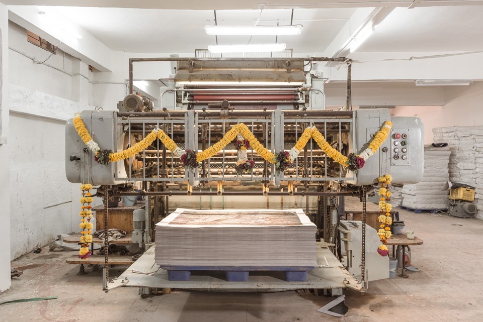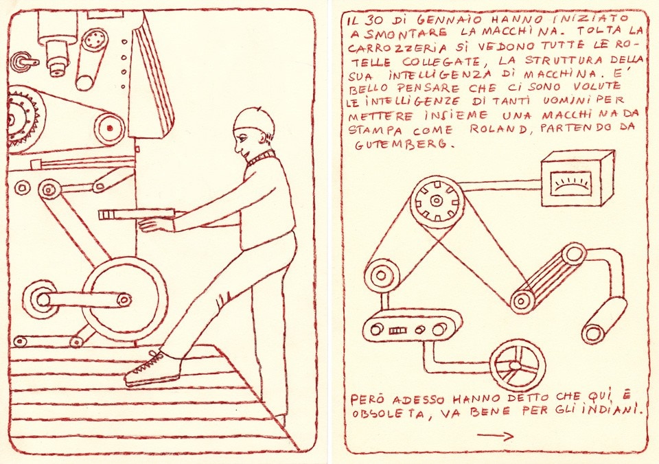 The exhibition also includes I giorni della merla, a series of drawings by Nathalie du Pasquier; the journal of the machine's disassembly; the Hermitage sound installation by Steve Piccolo; and the Polvere contemporanea 2012 - assenza di Roland offset prints by Luca Pancrazzi, printed on Indian cardboard by Roland Ultra in Manmad.
