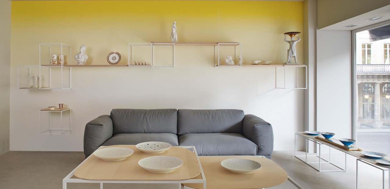The French-Japanese A+A Cooren Design Studio signed the interior design of the Cité de la Céramique's main gallery. The aim of the display system for the Manufacture of Sèvres was to enhance its four centuries history of creation through a selection of 100 pieces. Reminiscent of the sunrise in Asia, the vaporised yellow gradation opens a vertical evasion of the space, while the void created between the thin-edge plywood shelves and the light wire-cube structure, expresses the lightness and the impression of floating shelves.