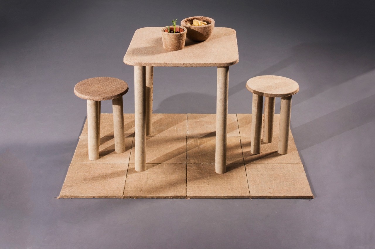 "I was surprised at the strength of the the final material," Yamamoto states. "The stool plate on the picture measures only 2 cm, and yet a person can sit on it. The table is very resistant as well." The designer points out how the use of jute fabric has diverse functions, while also reinforcing the material so that when a part breaks, the jute fabric holds it together, and it can still be used.