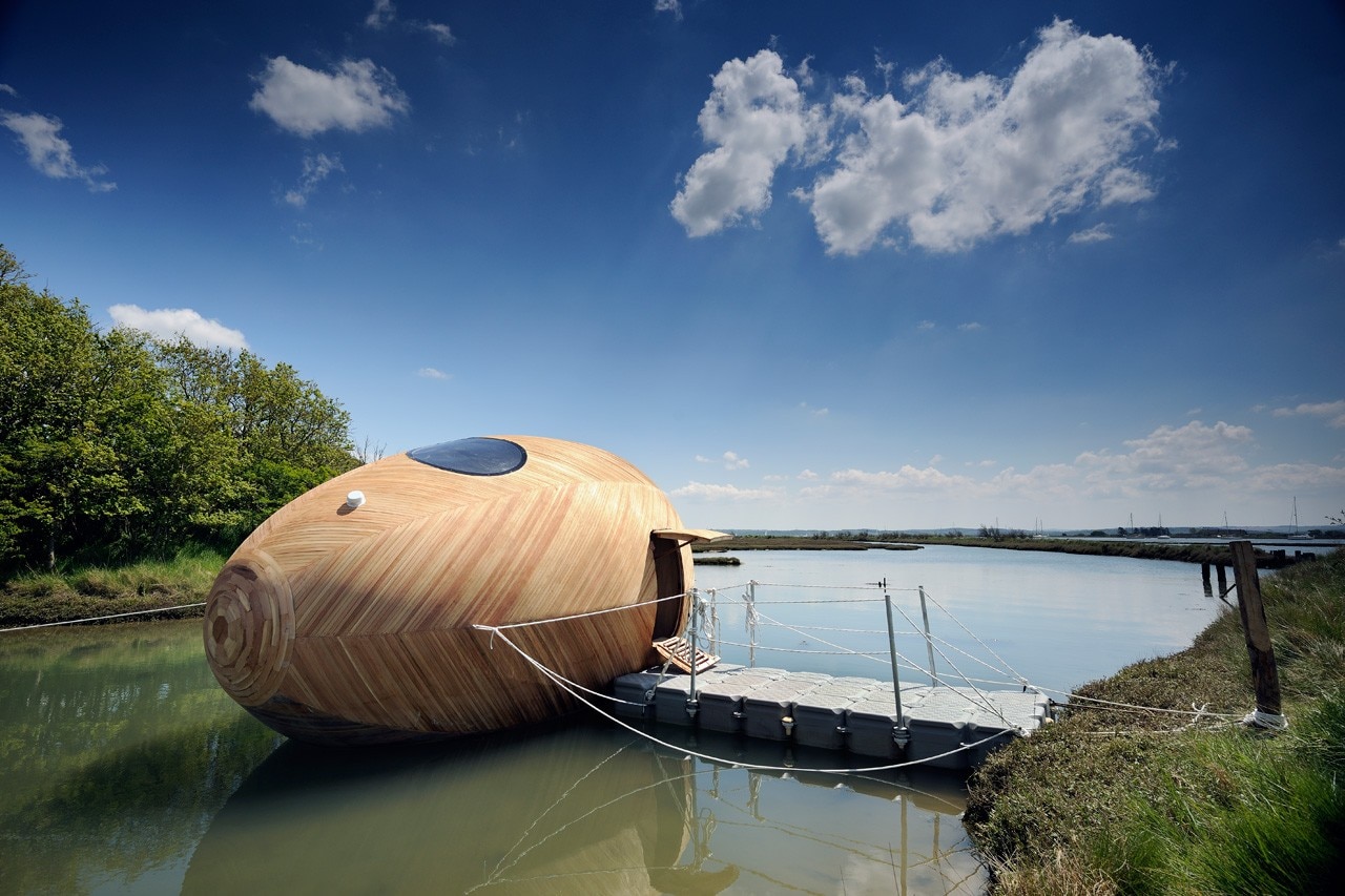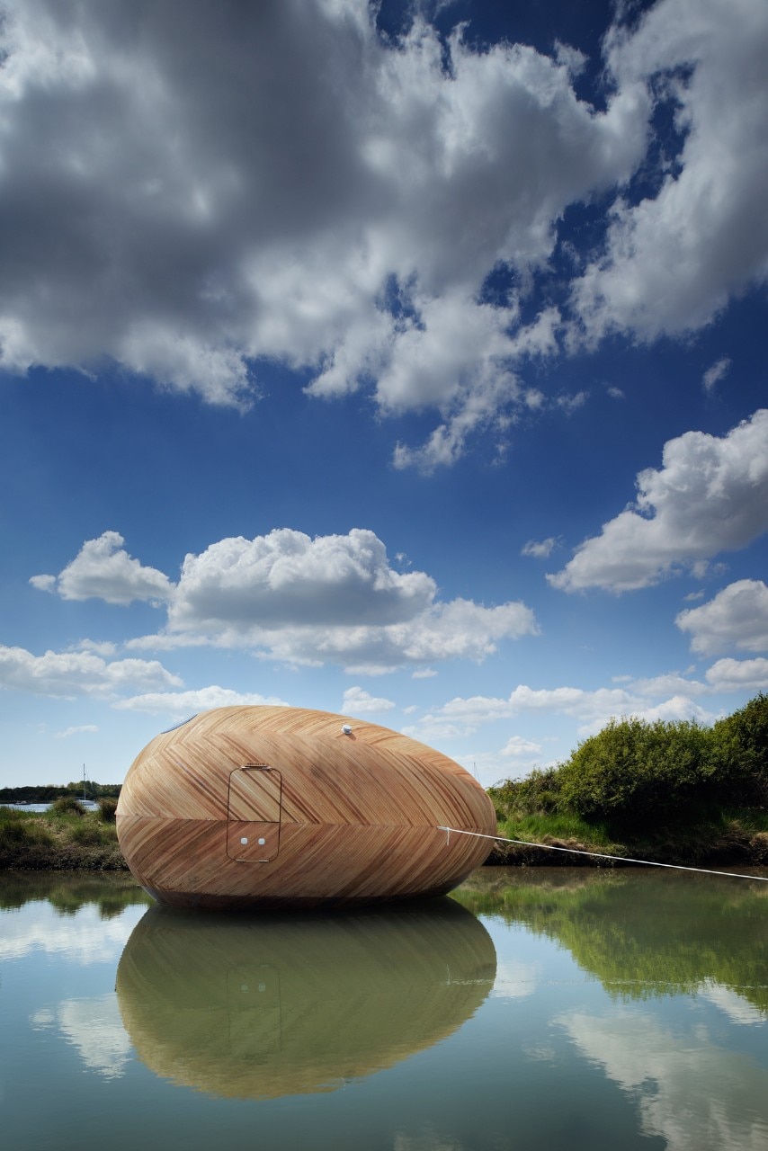 The Egg was inspired by the nesting seabirds on the shore. It was built locally, by boat-builder Paul Baker, as a cold moulded reclaimed cedar-sheathed structure approximately 6 metres long and 2.8 metres in diameter, whose aging will be tracked by the artist. Local Douglas Fir has been used for the supporting ribs and internal framing; continuing the age-old tradition of timber marine construction on the Beaulieu River.