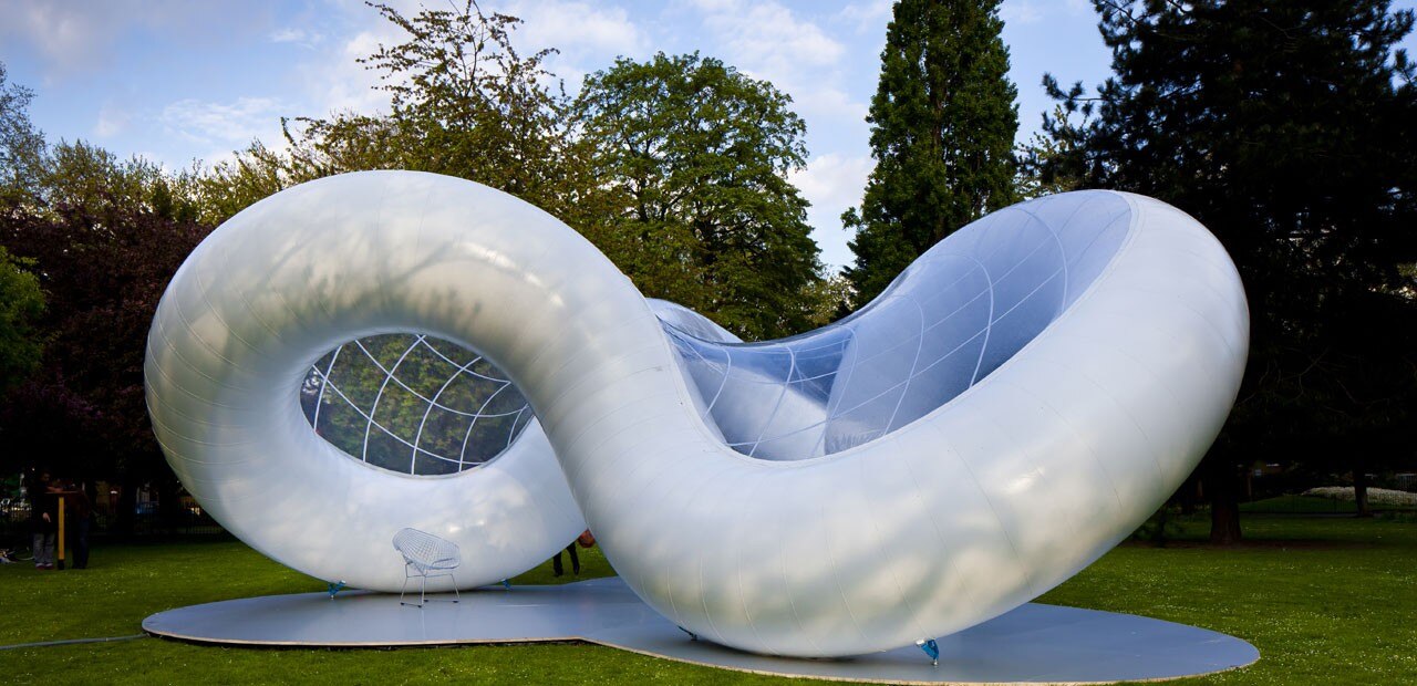 The Pavilion is 4 meters in height and 20 mq in area. Designed entirely with lightweight materials – 77.96 mq of PVC membrane and 20 mc of air – the pavilion is a selfsupporting structure; it is easily scalable to inhabit larger dimensions of other sites.