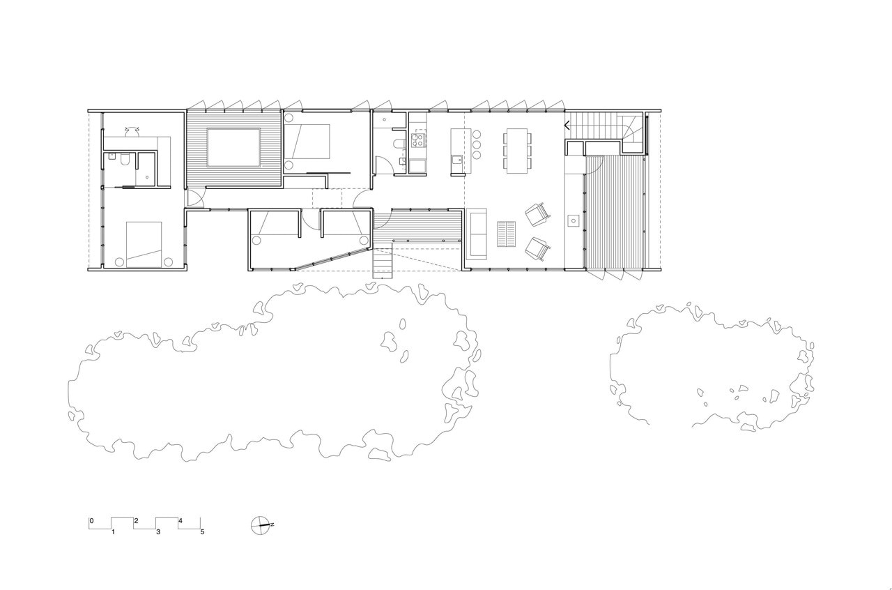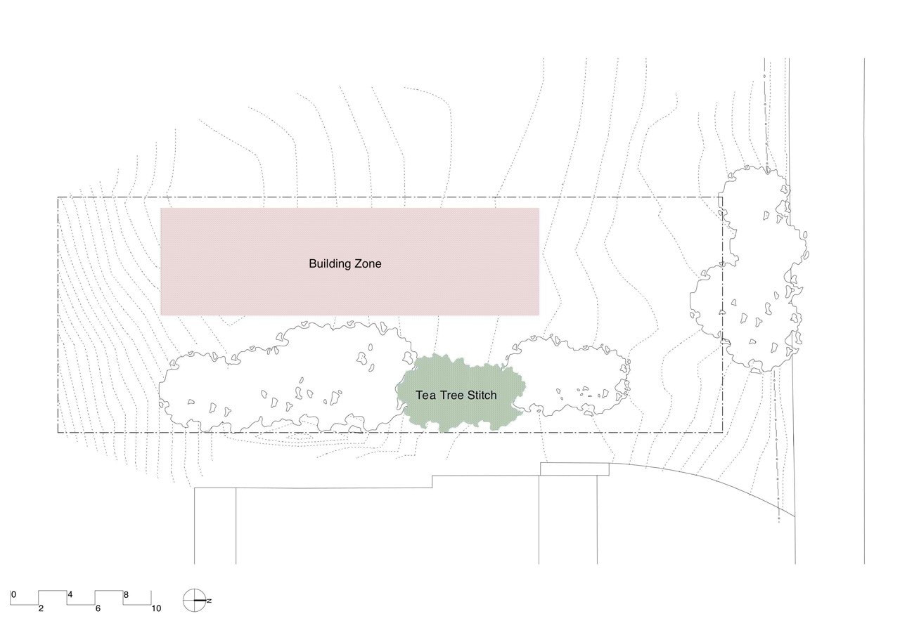 Sections of the building’s volume are cut away as required for different reasons: on the east side to allow the existing tea trees to continue to grow unhindered, on the west, an outdoor spa room sits unannounced, hidden within the overall volume of the building.