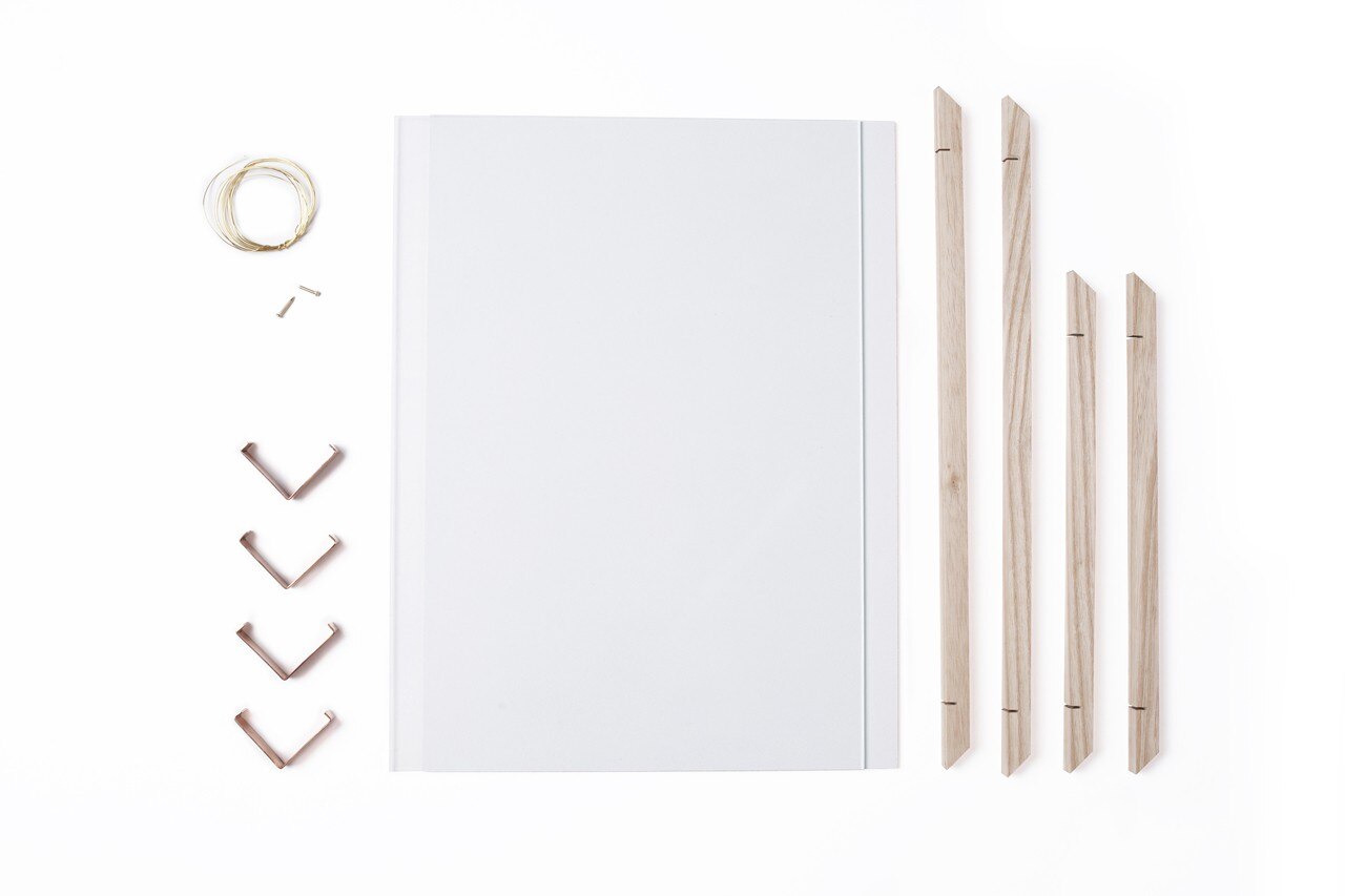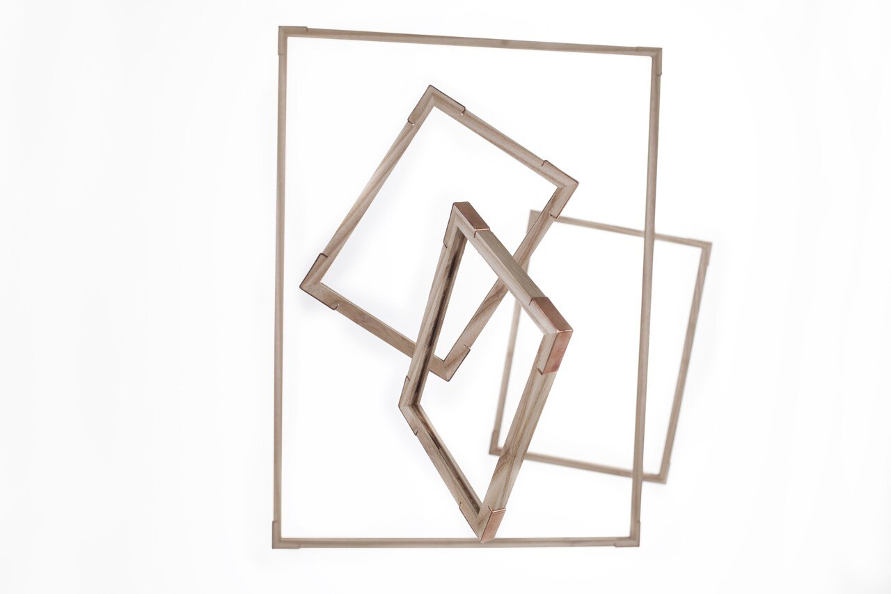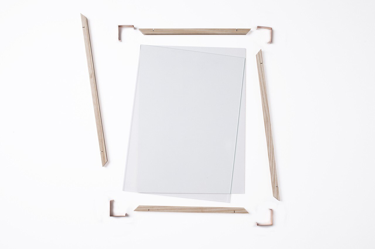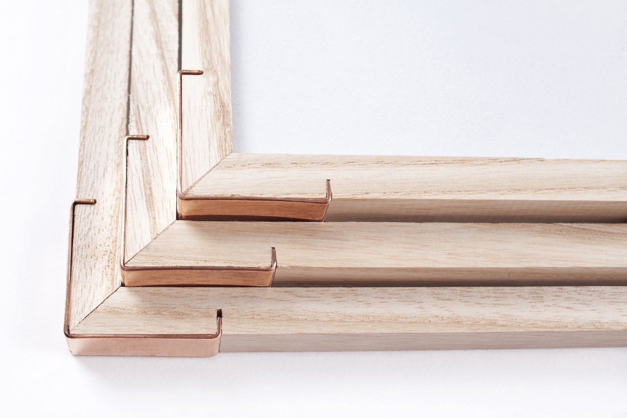 Ida Noemi and Caroline Olsson designed Epaulette, a frame system with a greater flexibility than traditional frames, focusing on the corners. The sides of the frame are held together by L-shaped corner profiles in copper, liberating the frame from any screws and fixed formats. The copper profiles are slid on to the corners as épaulettes and enhance the expression of the frame in a subtle, but characteristic way. The corners of a frame are what defines the silhouette and could looked upon as the shoulders of a picture. Epaulette is the French word for a shoulder piece, which can be used as decoration or to show the rank of a uniform.