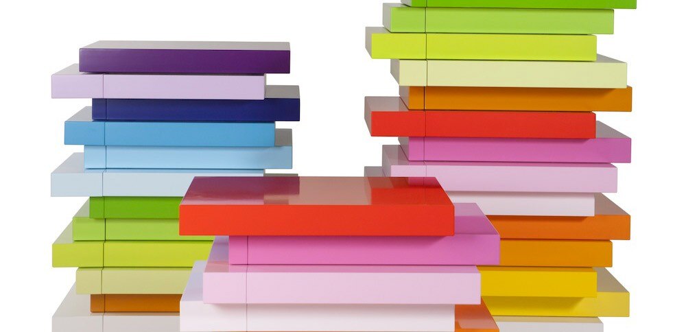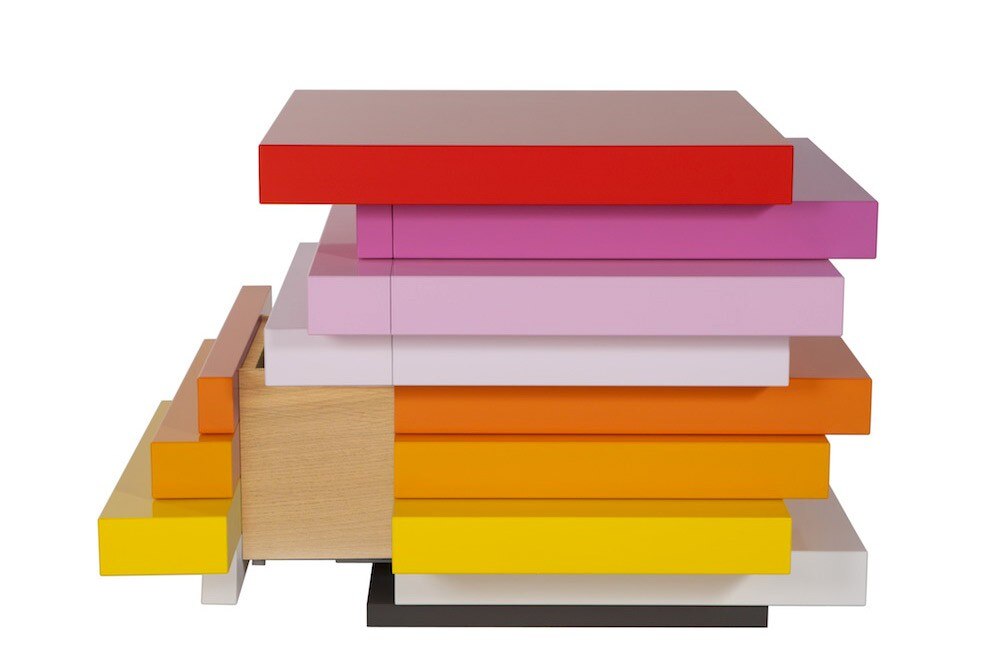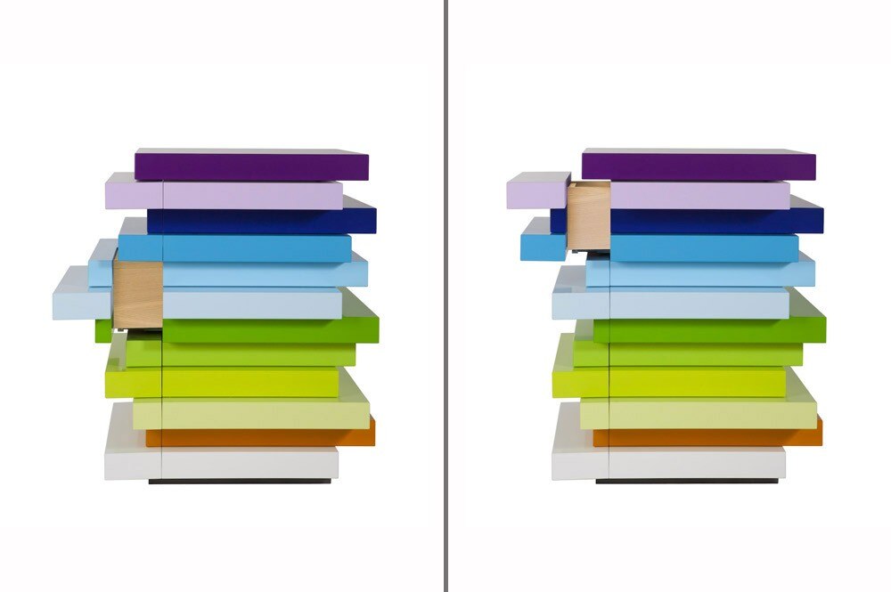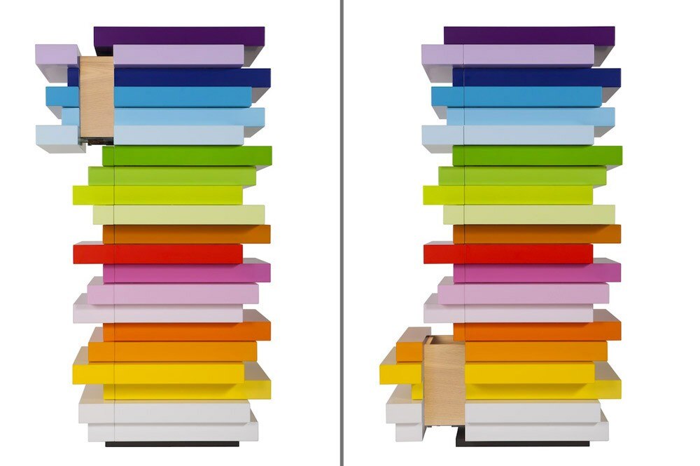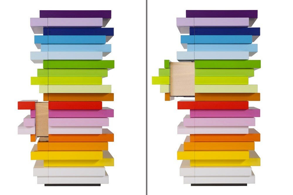 The colourful storage pieces are handmade out of layers of lacquered MDF and come in three sizes, 21 layers for a multicolor cabinet, 12 layers for a green-blue low cabinet and 8 layers for a yellow-pink bedside cabinet, all containing hidden drawers. The function of the Mille-Feuille may change according to the numbers of layers and the concept can be developed for other functions as a low table or a shelf.