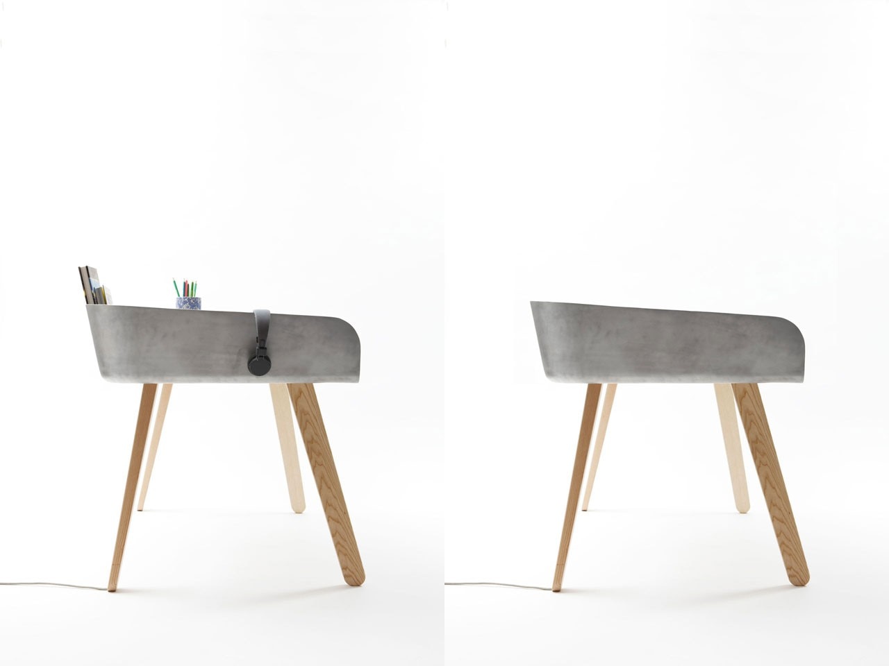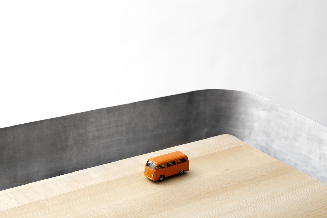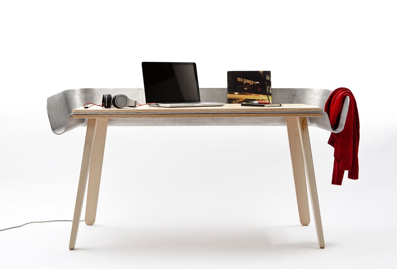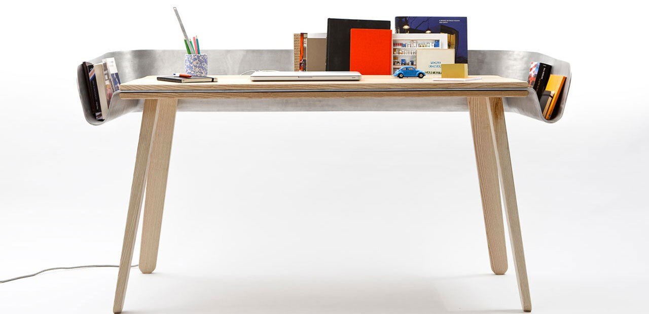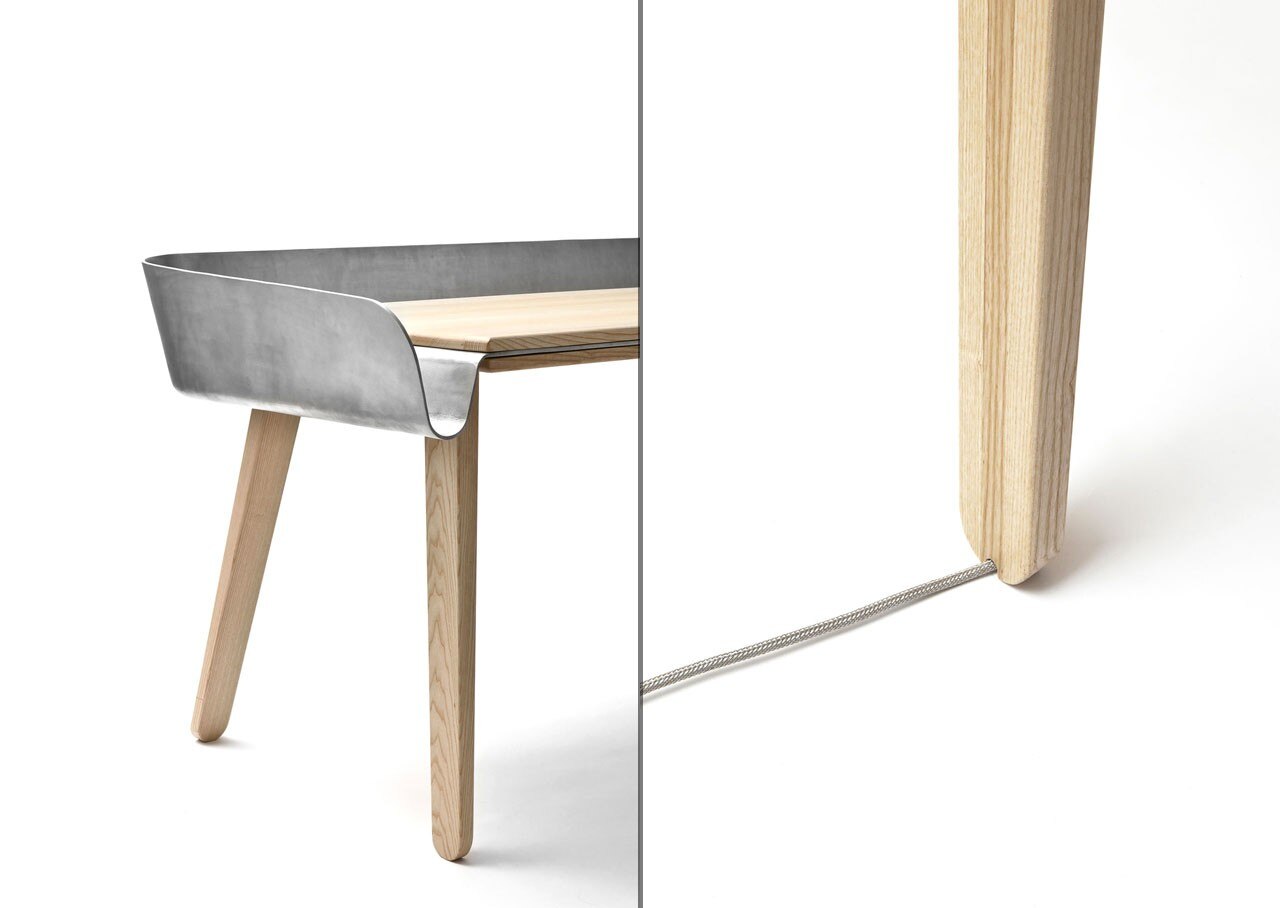 Tomas Kral says: “Homework is a work table which has been set to be even more functional: an aluminium cloth is placed on a wooden table then folded to form a refined extension, a toolbox to store documents, objects, photos… that you need or simply desire to work. The tilted surface enables you to lay down open books and continue reading like with a desk.”