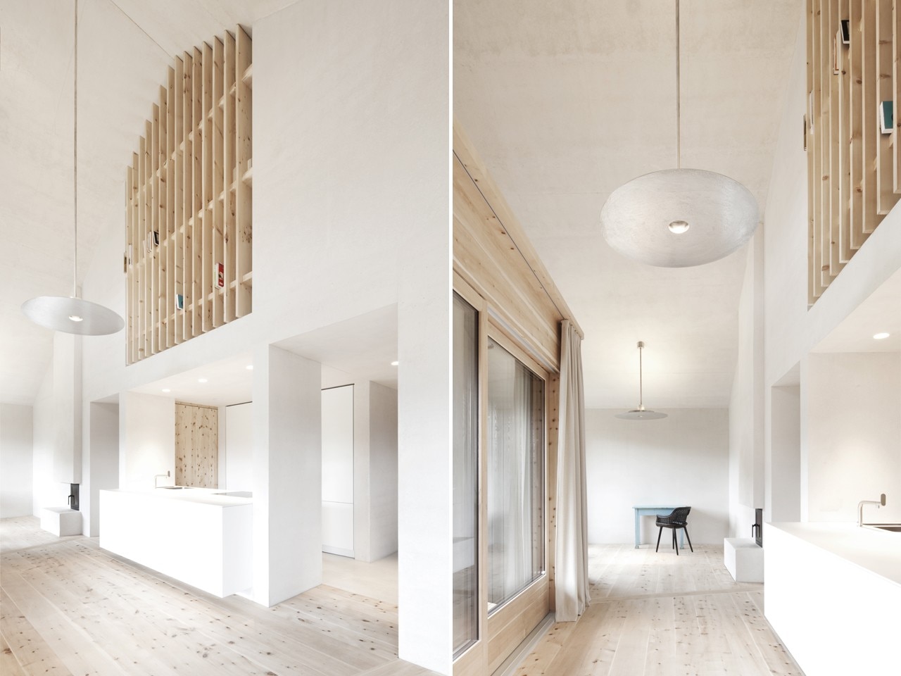 The two staggered buildings with their cautious insertion into the hillside correspond to the local couple court type. Regional ornaments and characteristic features like saddle roof, loggia and wood façade are taken up and realized in a new, pure and independent way.