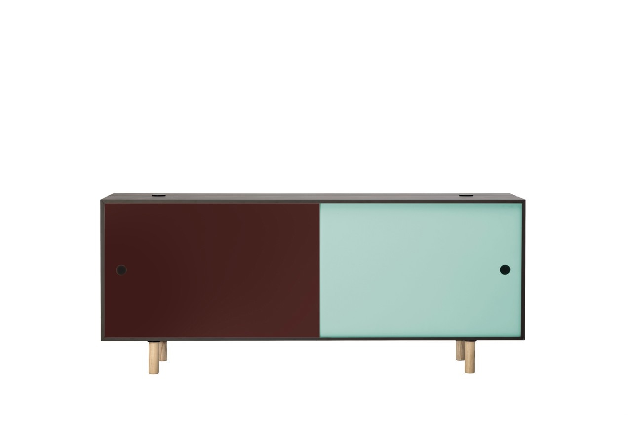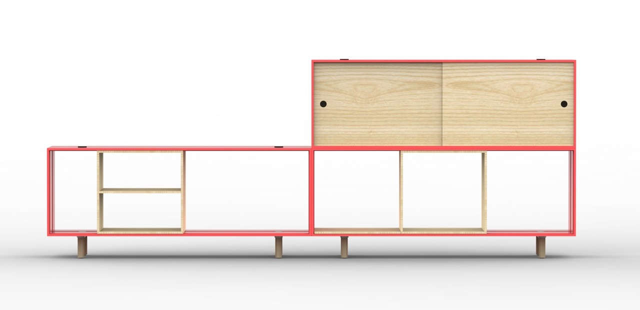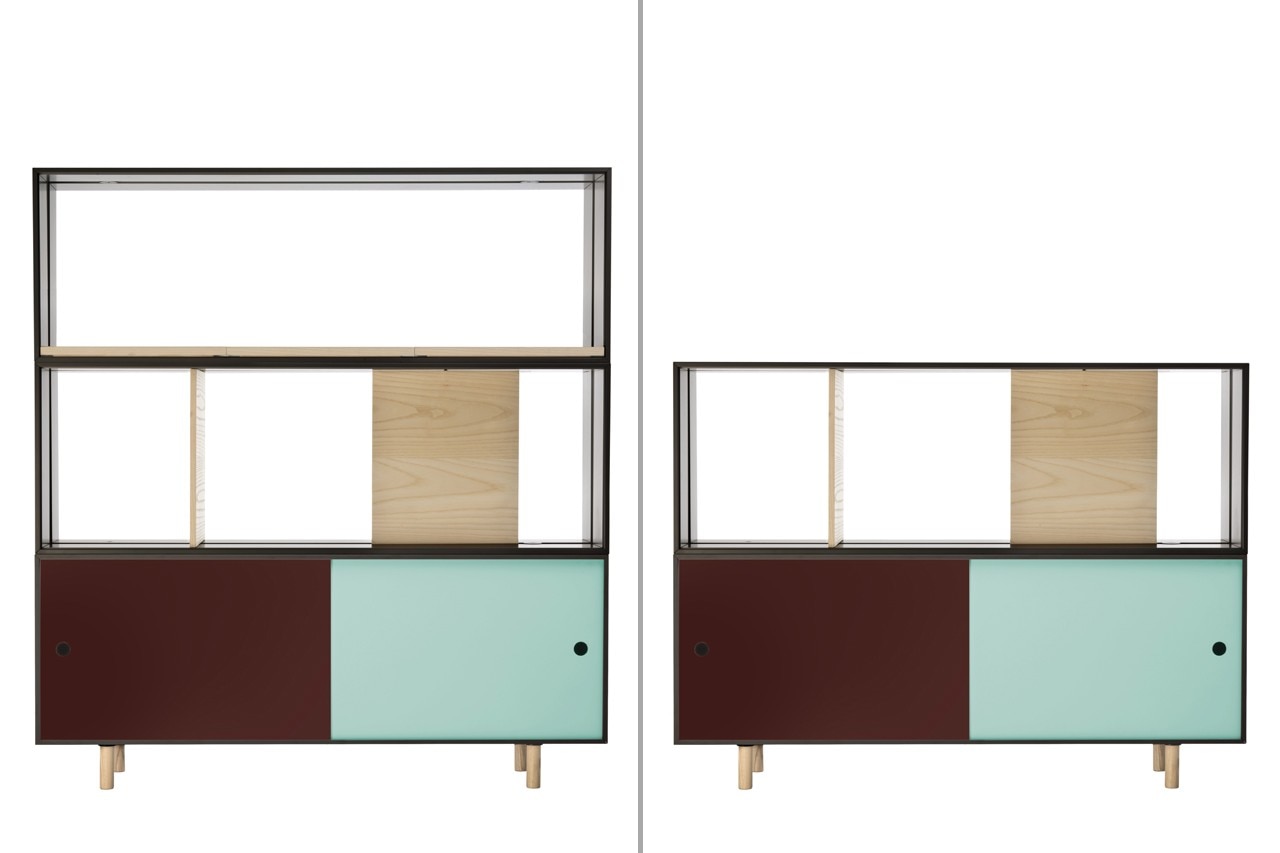 Constructed from a single aluminium extrusion, the basic unit works both as structure as well as the main storage element. A single line runs across the shelving system allowing for different accessories to be added, such as trays, boxes, dividers or book holders. The units can be left open or closed with sliding doors in multiple materials and finishes.