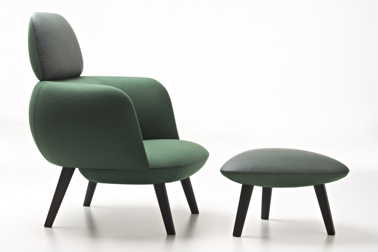 The big headrest and the high armrests create a comfortable look and feel, with many possibilities of color combinations and finishes to choose from. Betty is available with or without headrest. An ottoman completes the little family, which can be used as a stand-alone seat.