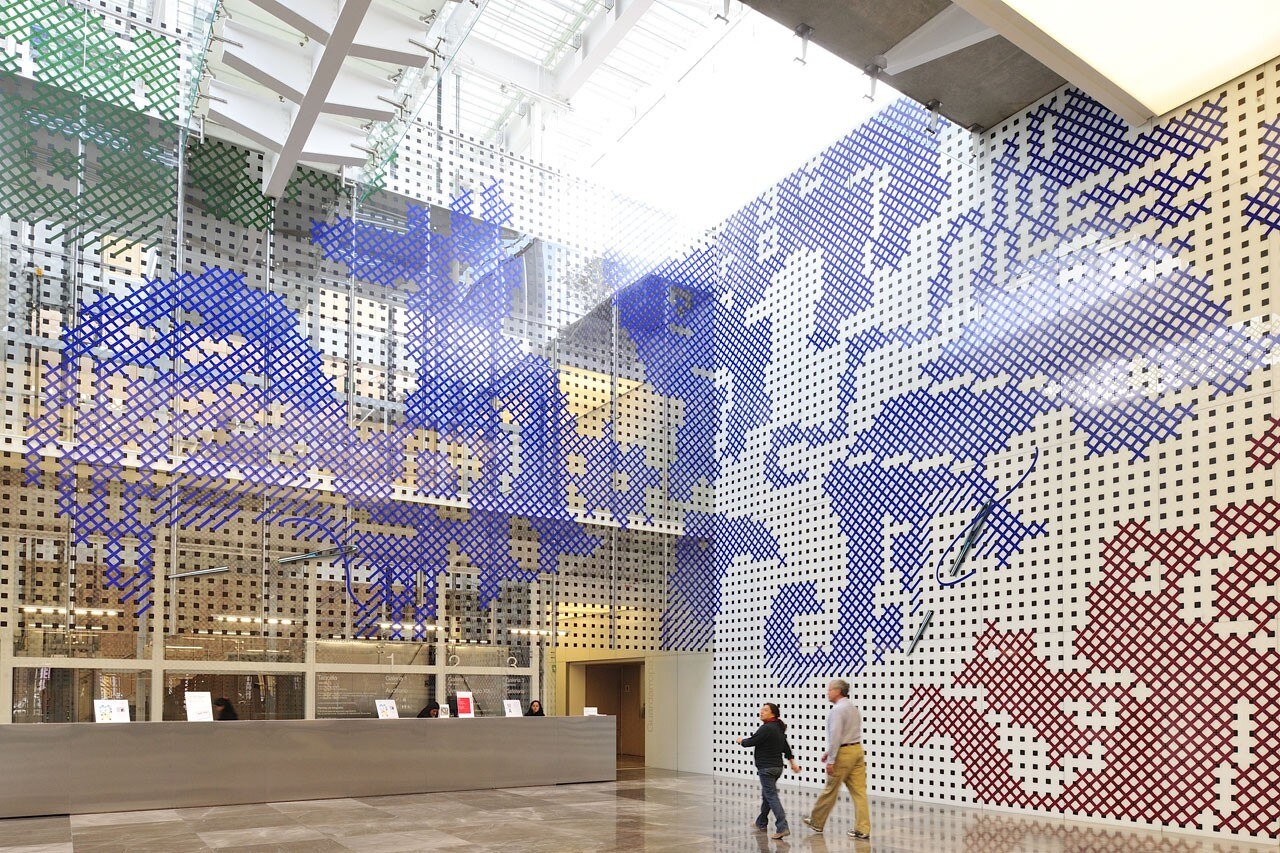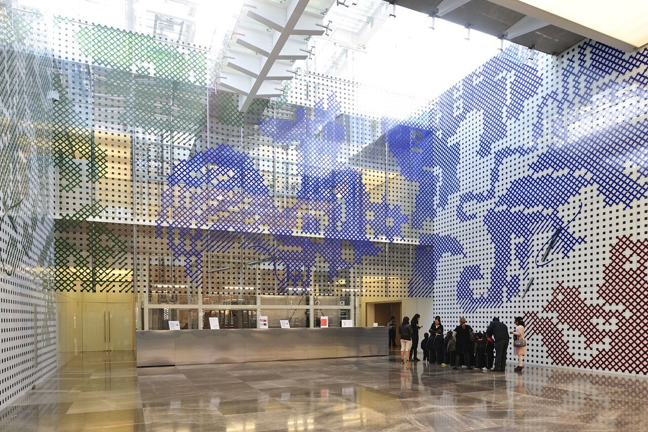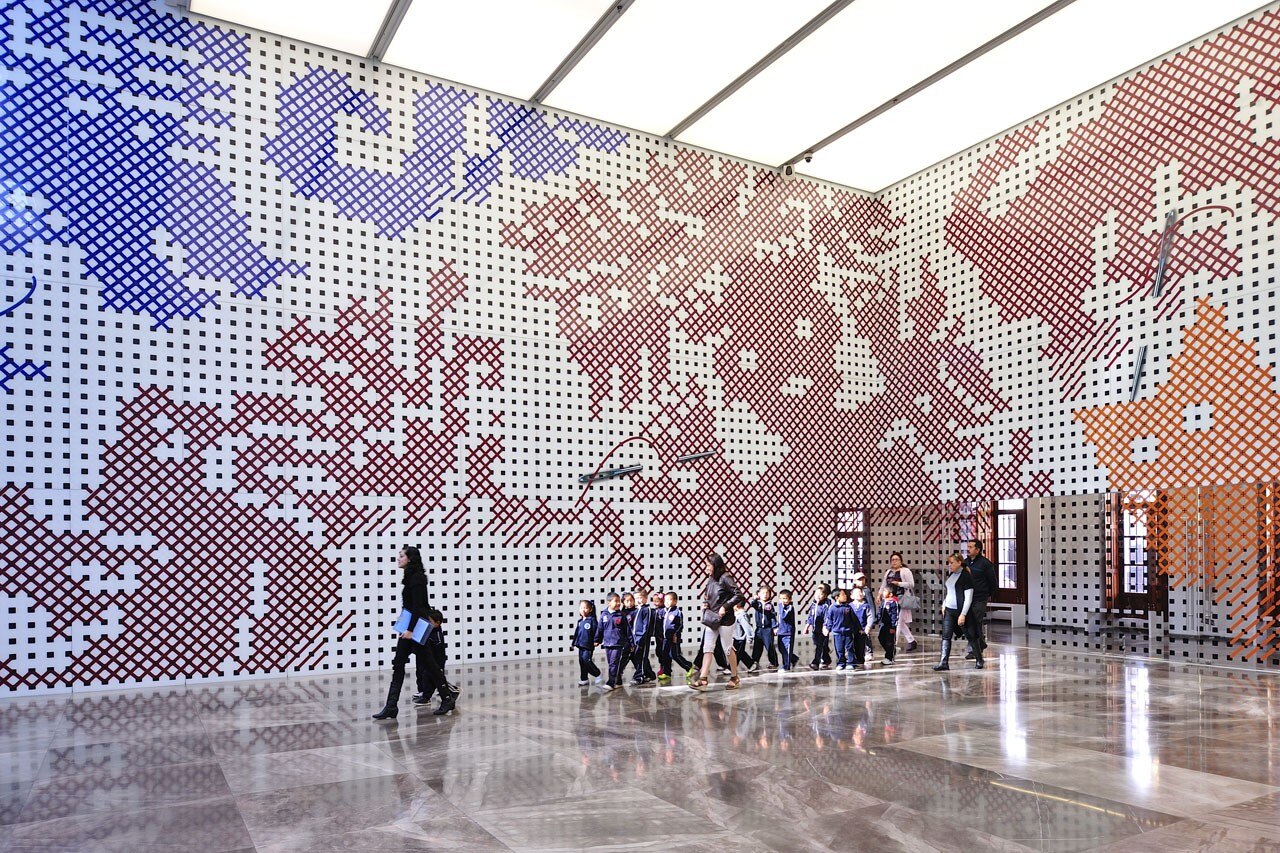 Using animal designs taken from popular imagery of Puebla and worked on a grand scale on adhesive vinyl enlarged to the point of almost reaching abstraction, the artist recreates a monumental embroidery on cross-stitch integrated into the walls of the Museum. Added to this giant embroidery are needles and threads meant to reflect a work in progress.