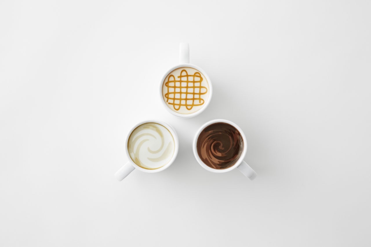 For Starbucks Japan, Nendo revamped the classic white coffee mug, adding a graphic to the base that looks like the surface of 3 coffee drinks: americano, latte and caramel macchiato.