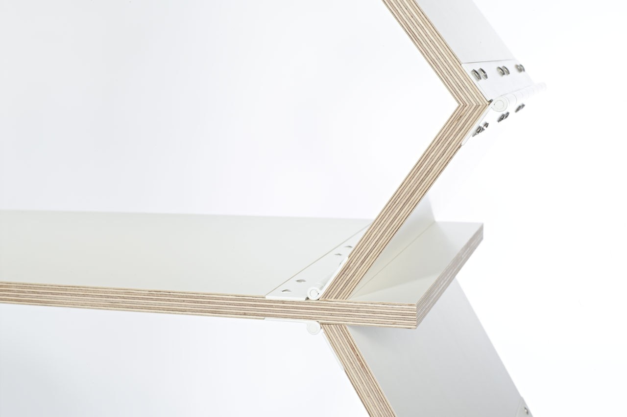 As an alternative to plug and screw connections this shelf needs no assembly and is delivered folded up. The side walls are split, mitred and fixed with piano hinges. The system is fully linked together; the shelves just have to be unfolded. The system is self-stabilizing via the mitre-chamfer on the side wall edges.