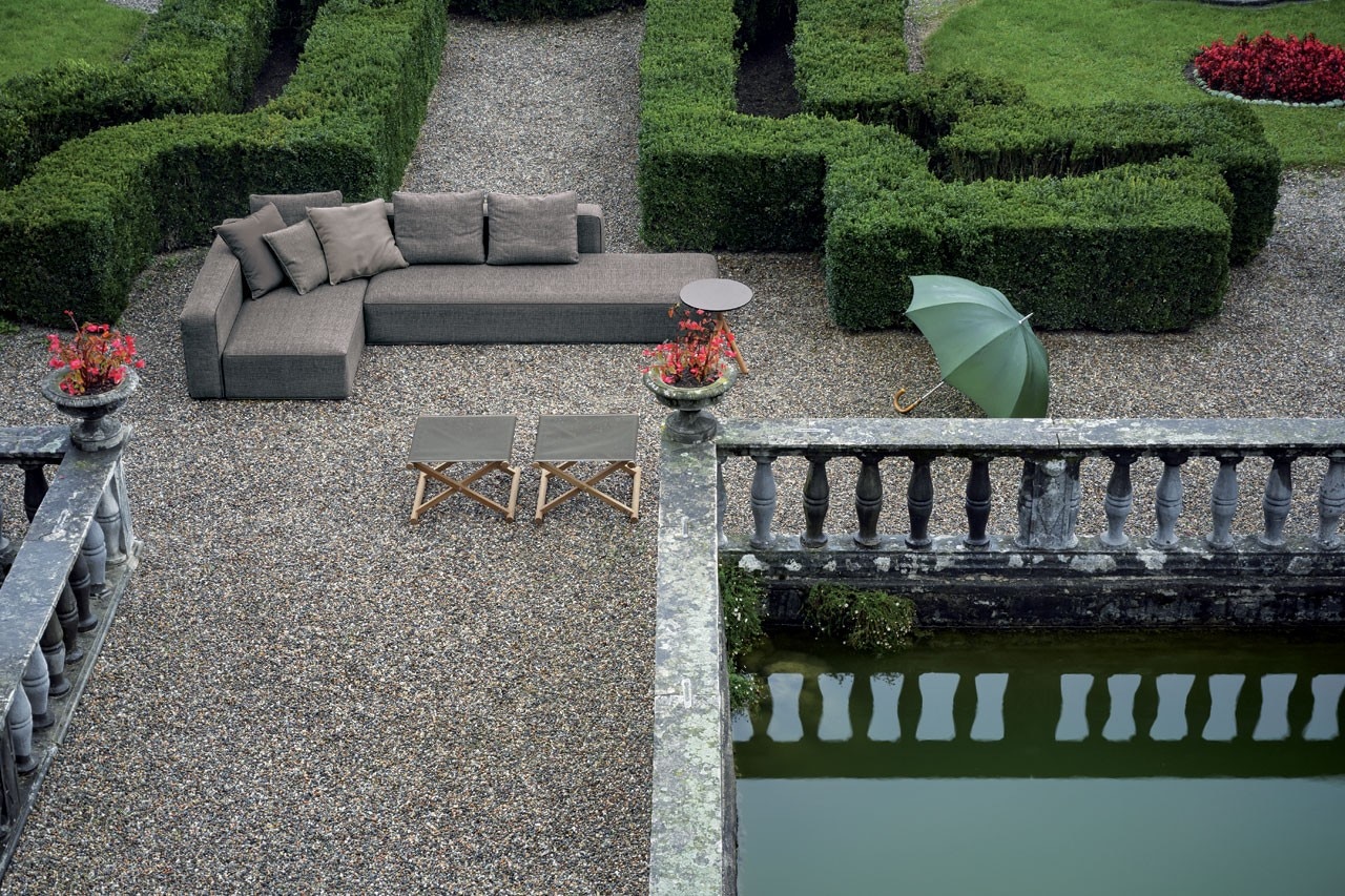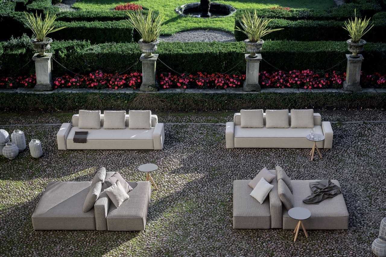 With the sofa system Dandy, Rodolfo Dordoni declined for Roda the iconic textile sofa for indoor use in a completely new proposal for outdoor.