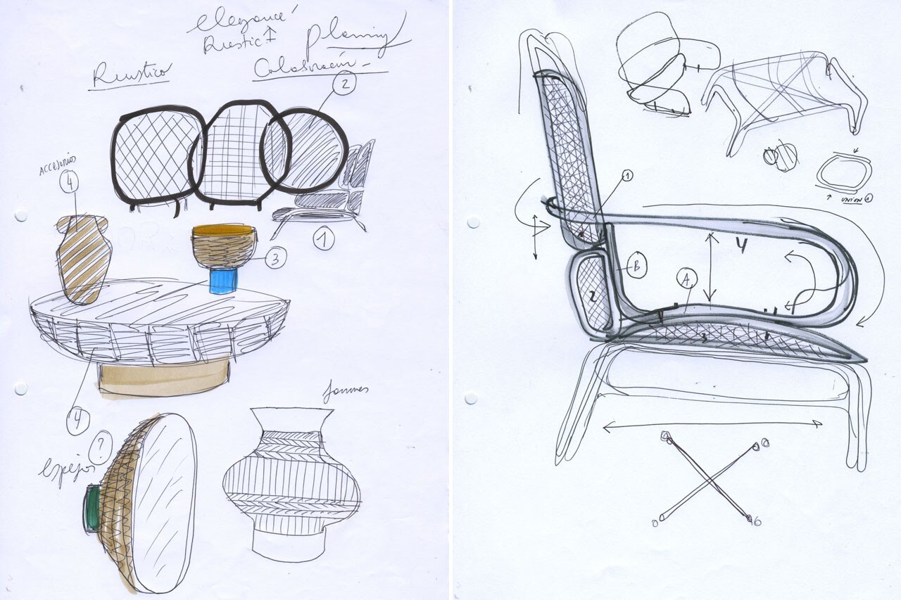 Each screen of wicker frames a classic braiding that evokes the past, but the whole takes the sinuous forms characteristic of the designer and his illustrations. Jaime Hayon takes advantage of the continuity that these fibres are able to provide to follow the line of his drawings, while other materials would have required assembly.
