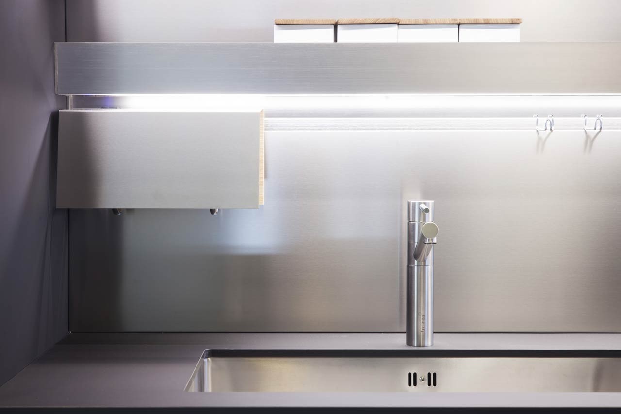 The Convivium kitchen designed by Antonio Citterio for Arclinea, presented at Milan Design Week, has been extended with a new ultra-accessorised shelf that incorporates a range of functions.