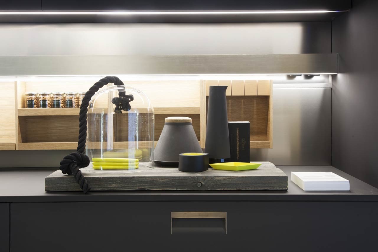 This year, Convivium sees the addition of "Mensolinea" a new, accessorised shelf with a stainless steel finish and LED lighting complete with USB and Schuko sockets, a domestic glasshouse for plants, kitchen roll holder, iPad stand, knife-storage, ceramic spice-holders, bottle-rack, wooden shelf and ceramic vase holder.