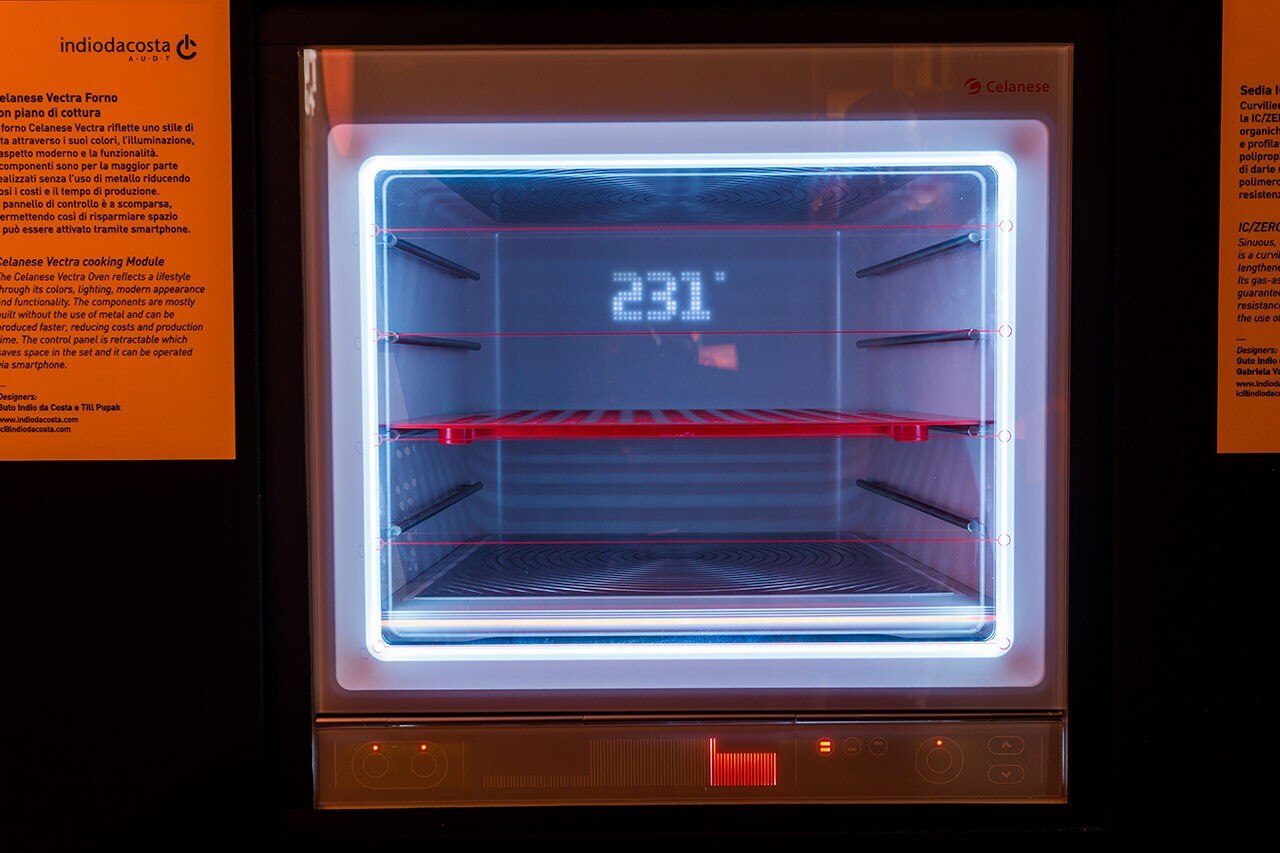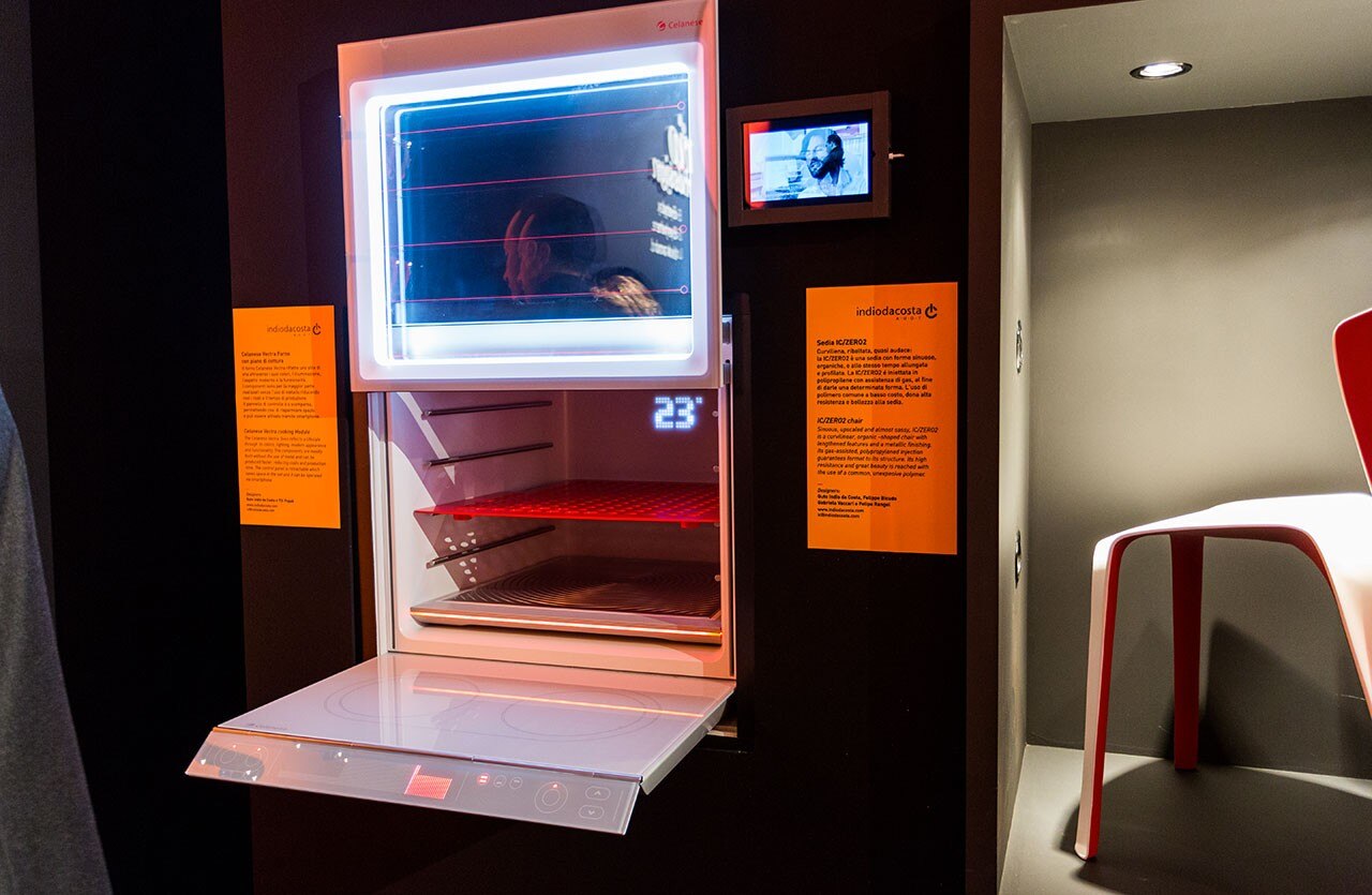 The Brazilian designer Guto Indio da Costa tests the scope for a thermoplastic polymer, patented by the American company, on an oven exhibited at Rio+design during Milan Design Week.