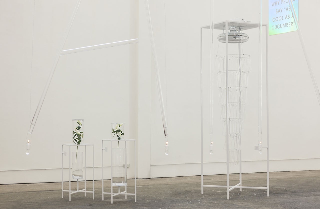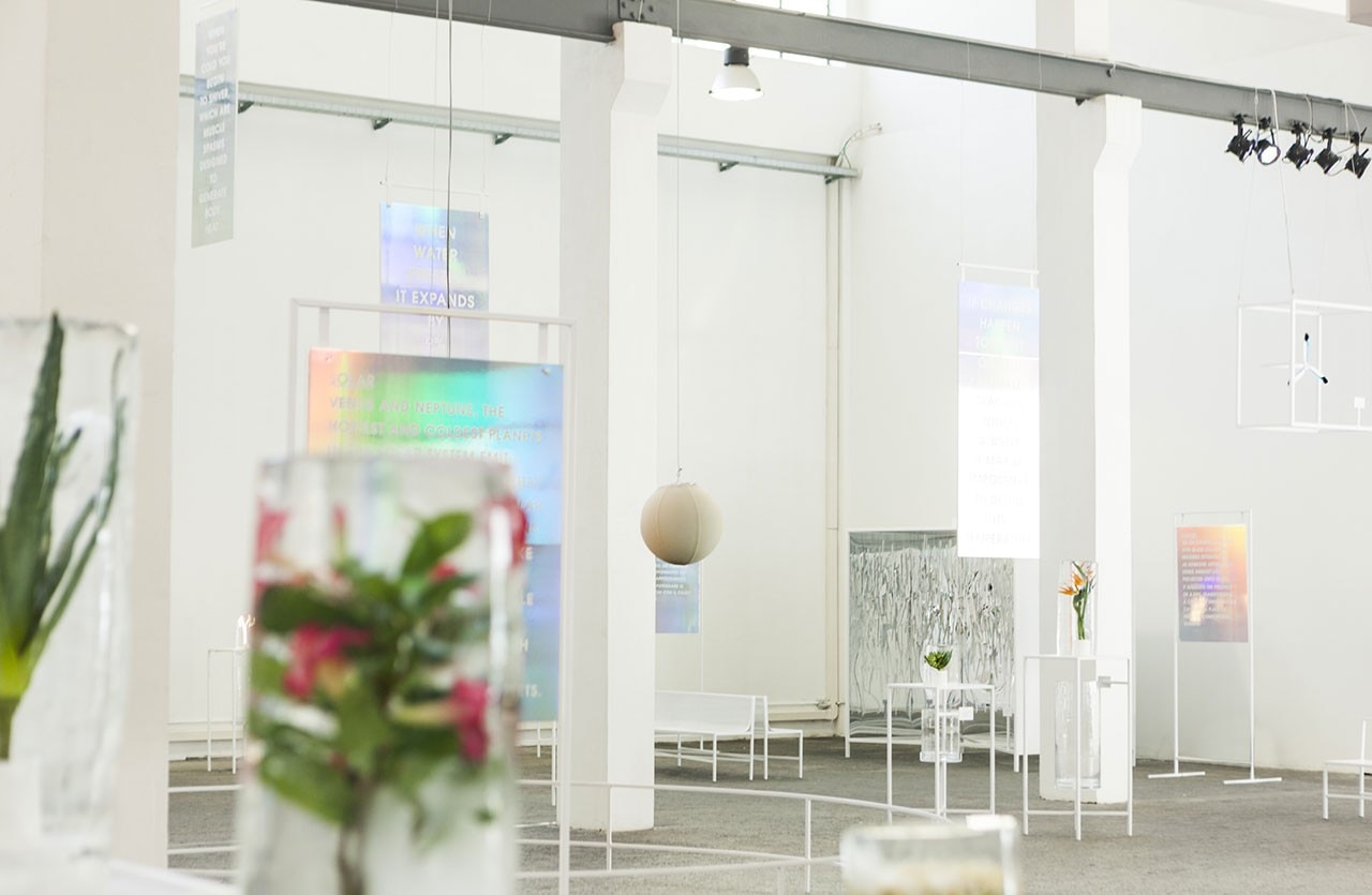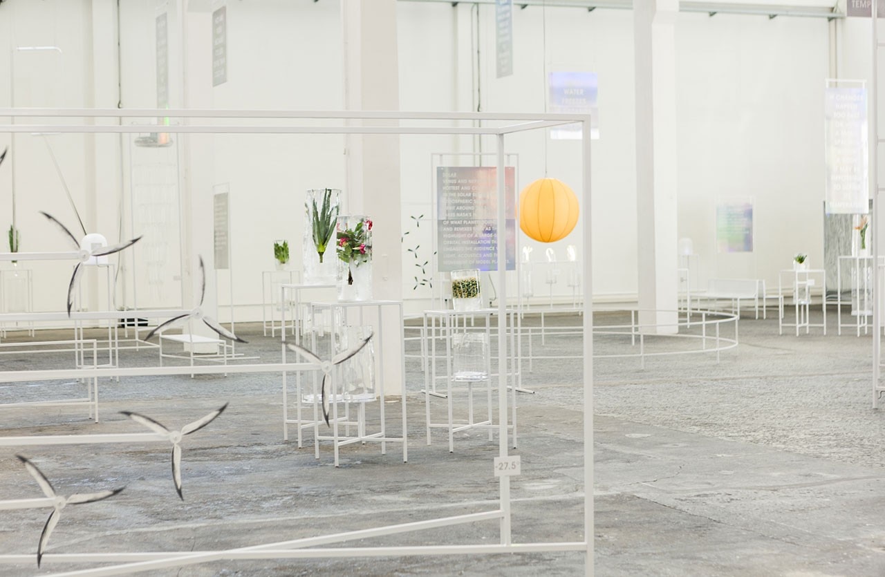 The exhibition presents eight main design themes that develop the same concept with different formal results, distinguished by a stated temperature. These range from delightful bases for plants enclosed in ice cubes – agaves that live at 19.1°C, cactus at 17.2° and aloe at 25°C – to installations of propellers, single or in groups, that represent the annual bird migration from cold to hot climes. One of these birds, the Arctic Tern, is the bird that spends the most time in the daylight, flying every year from the Arctic to the Antarctic, where it encounters an average summer temperature of -27°C.