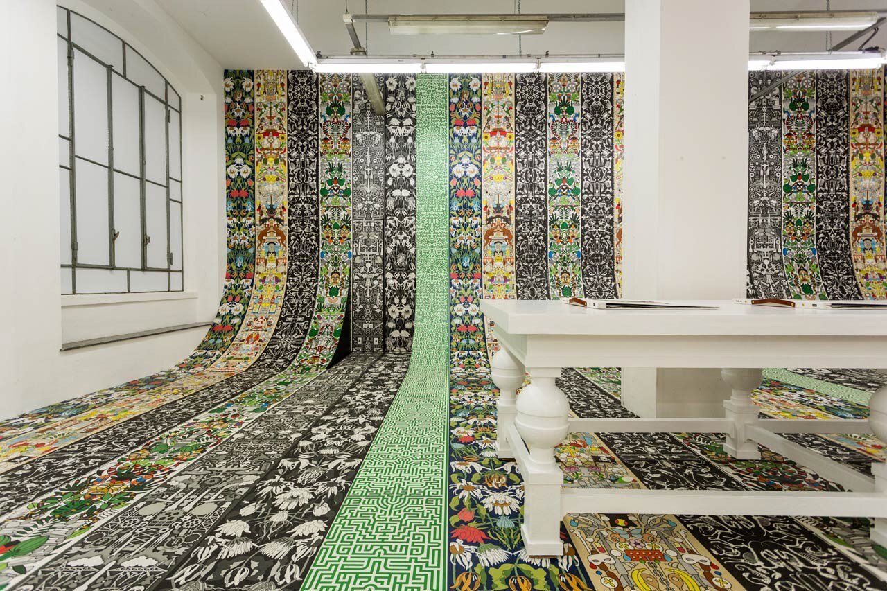 Job Smeets and Nynke Tynagel have drawn on their creative universe to develop wallpapers adopting archetypical drawings and universal symbols as iconographic features for their patterns and compositions, ultimately creating seven designs: Industry, Labyrinth, Perished, Alt Deutsch, l’Afrique and Withered Flowers.